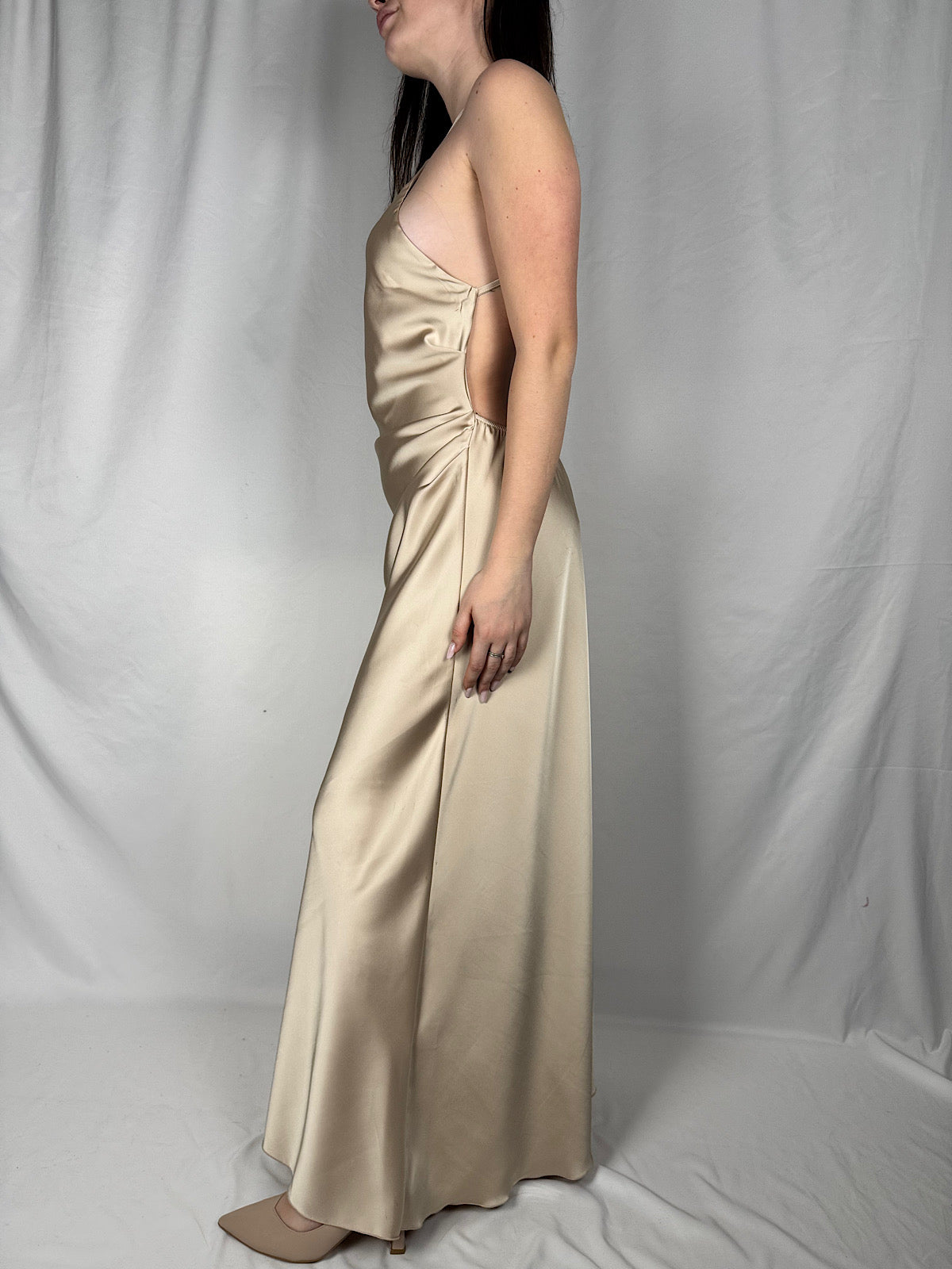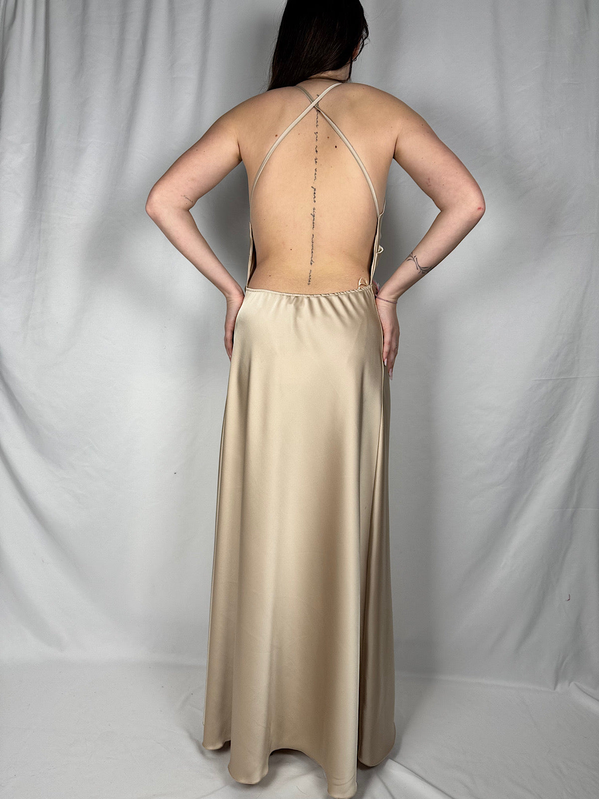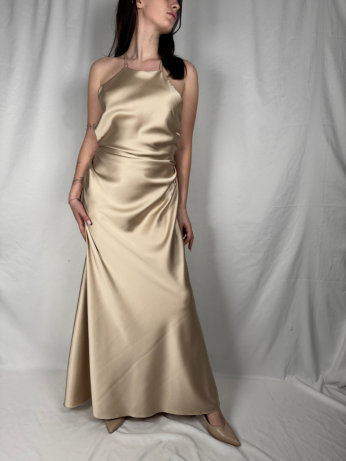 Abito lungo con spalline sottili incrociate sul retro. Regolabili. Dettalgio scollo halter. Drappeggio sul davanti.