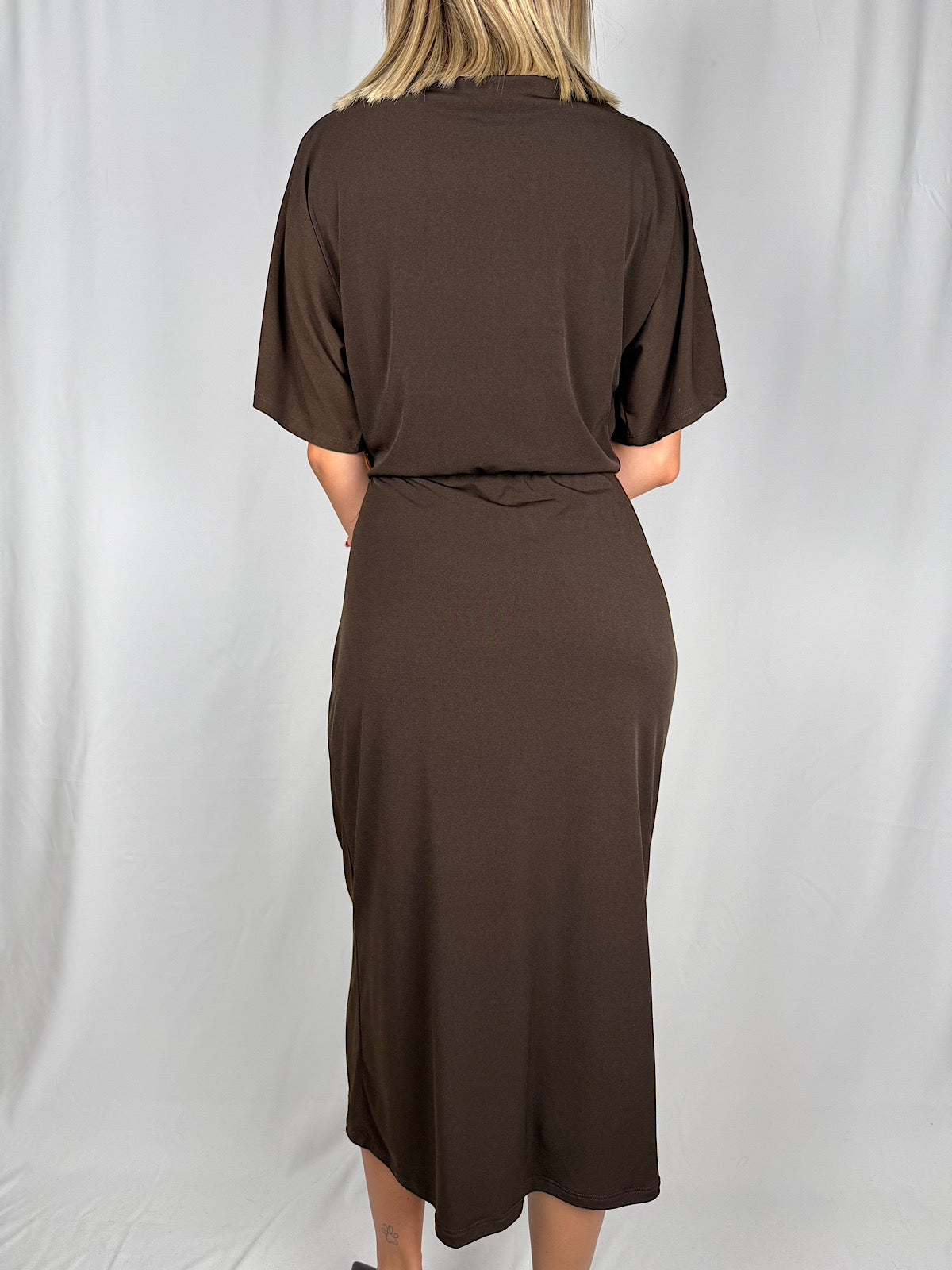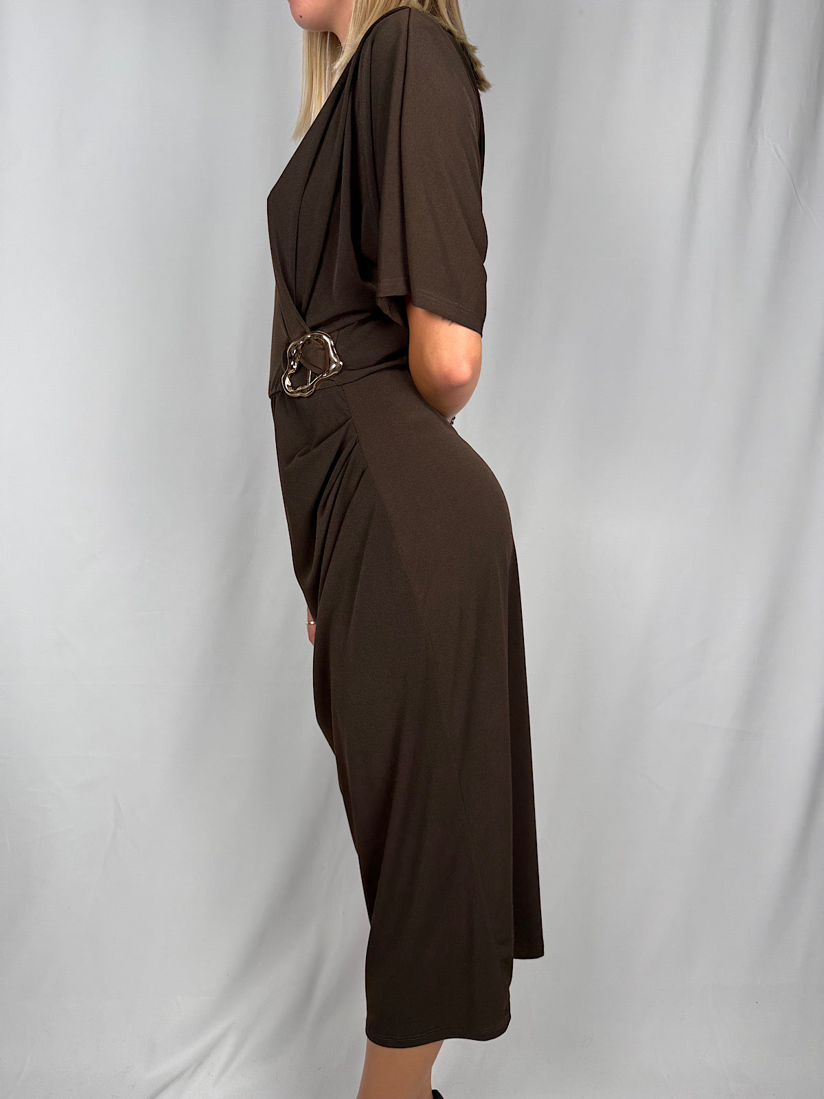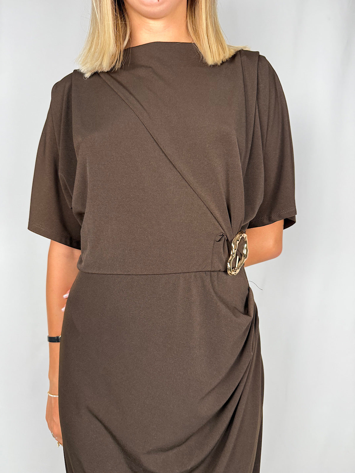 Abito lungo Susy Mix Moro a maniche corte con drappeggio laterale decorato con gioiello oro.