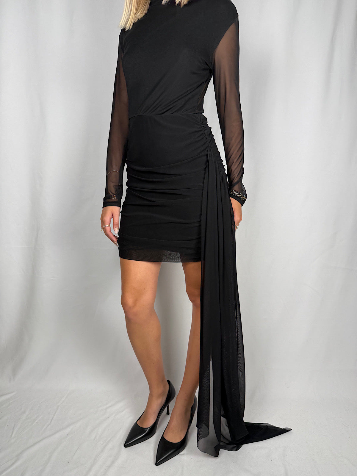 Abito corto in tulle nero Lumina con sottoveste. Tulle laterale a strascico