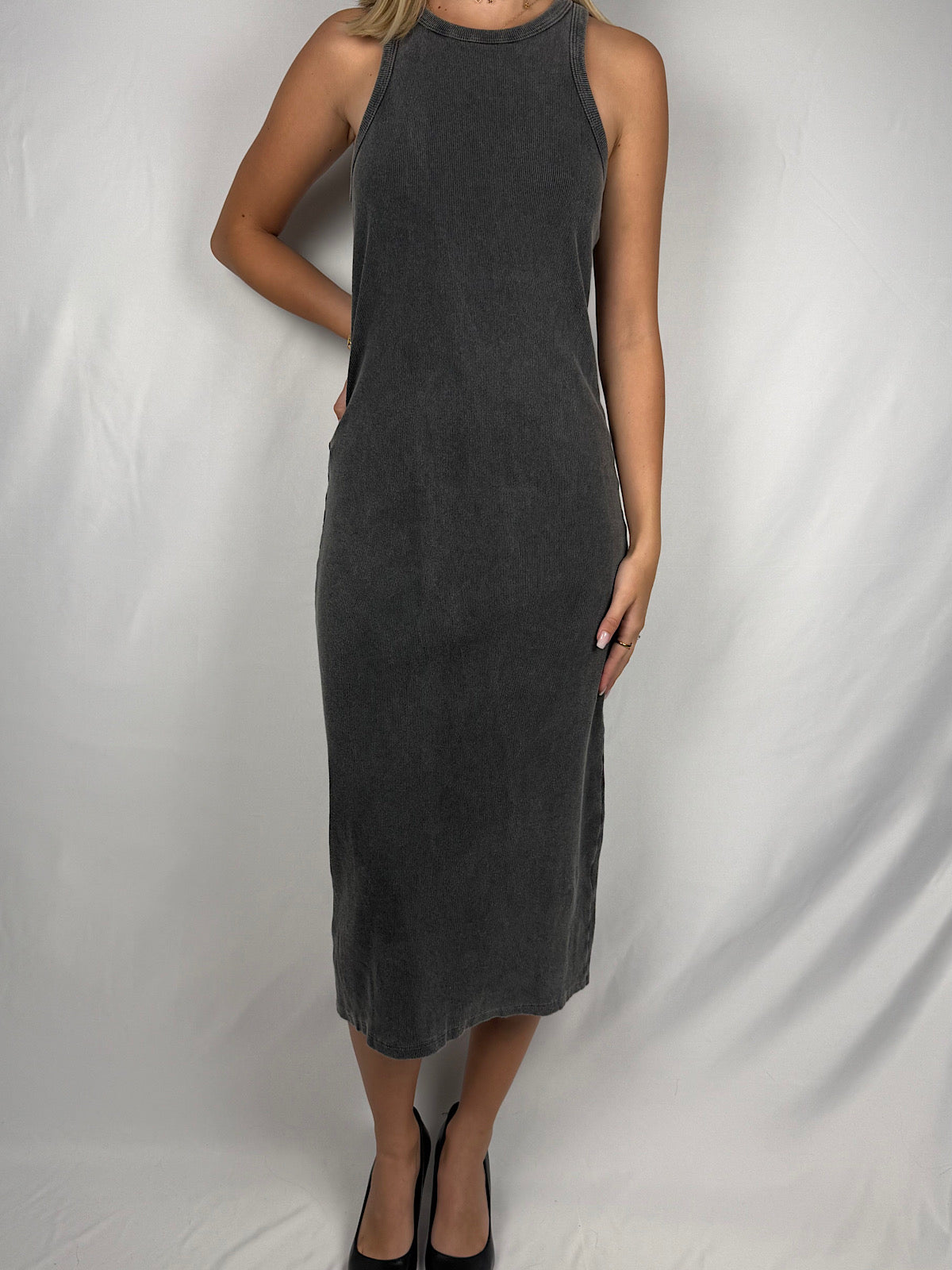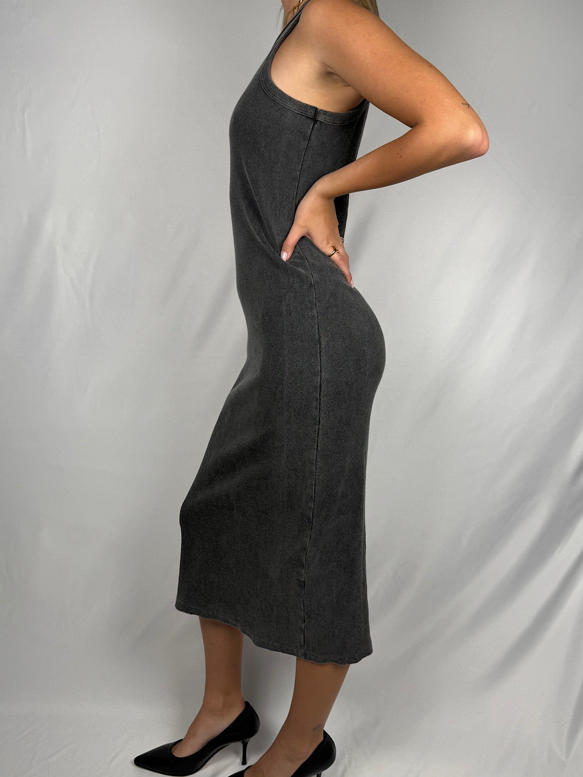 Abito a costine con scollo vogatore effetto marmorizzato.