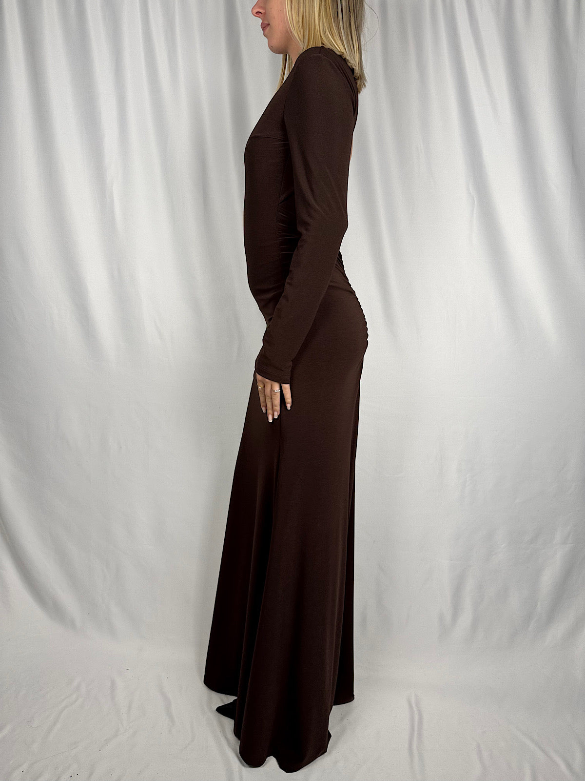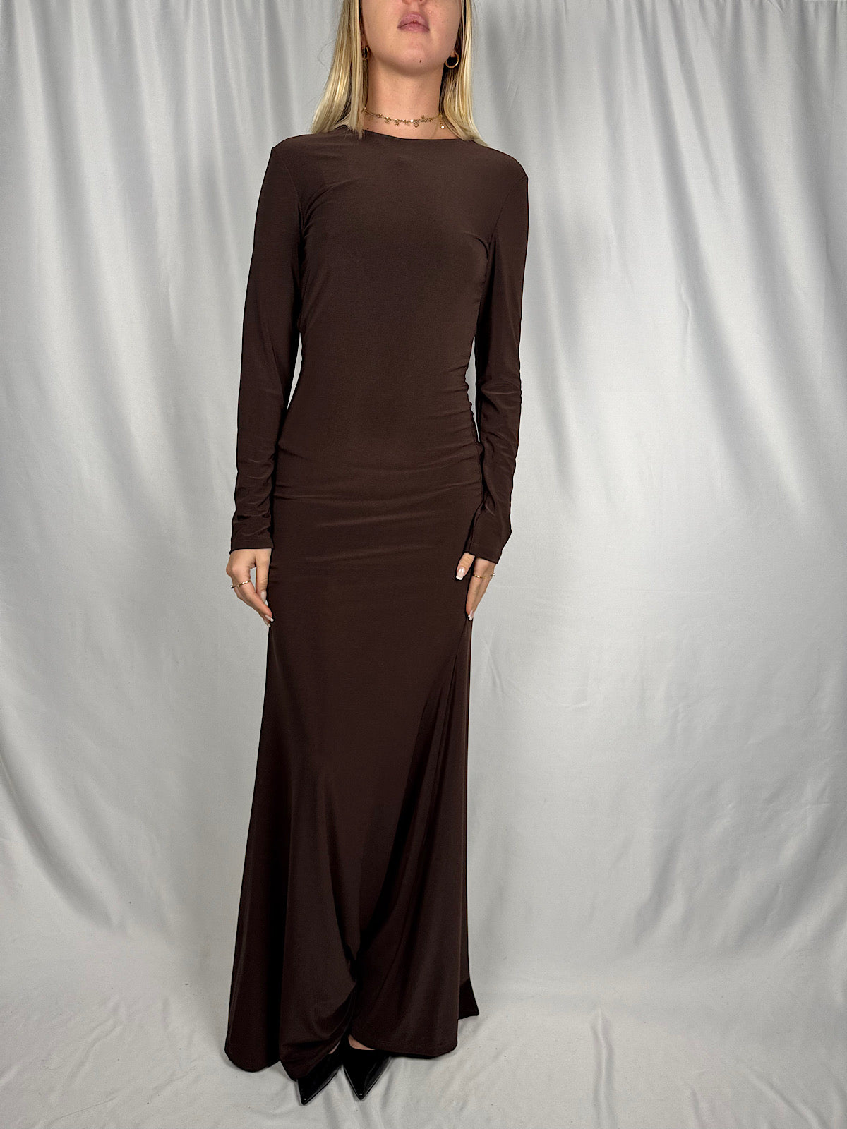 Abito lungo con scollo profondo posteriore e arricciatura.