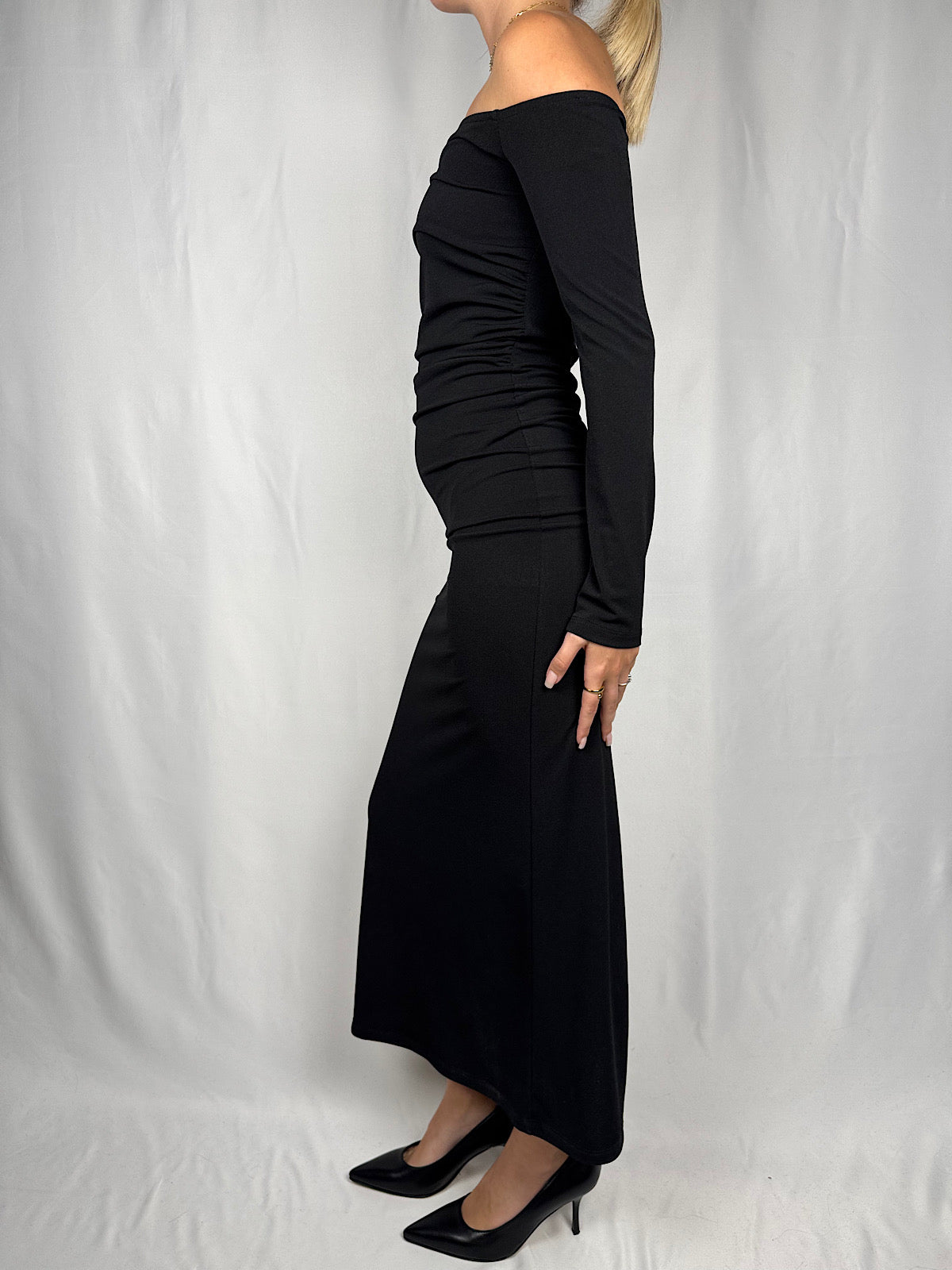 Abito lungo in jersey con scollo bardot e maniche lunghe. Fit aderente con arricci laterali e spacco sul retro.