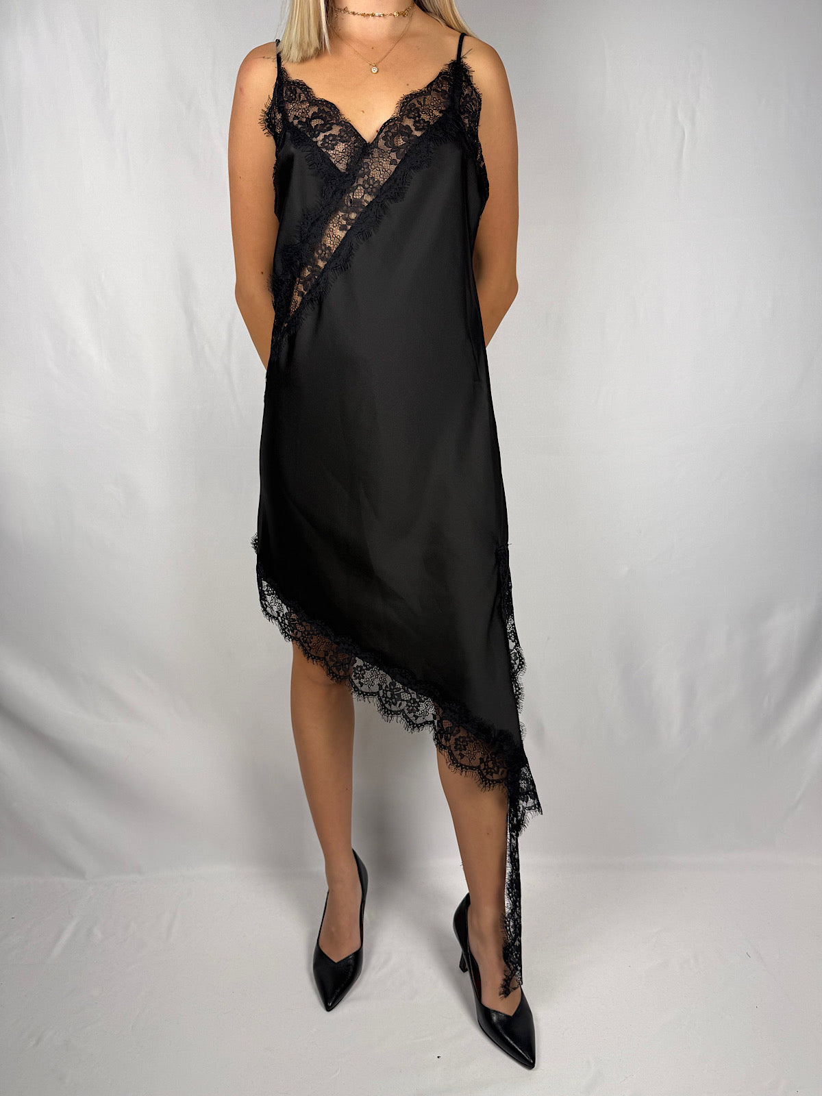 Abito spalline sottili con scollo a V, dettagli in pizzo , taglio asimmetrico con spacco nella parte più lunga.