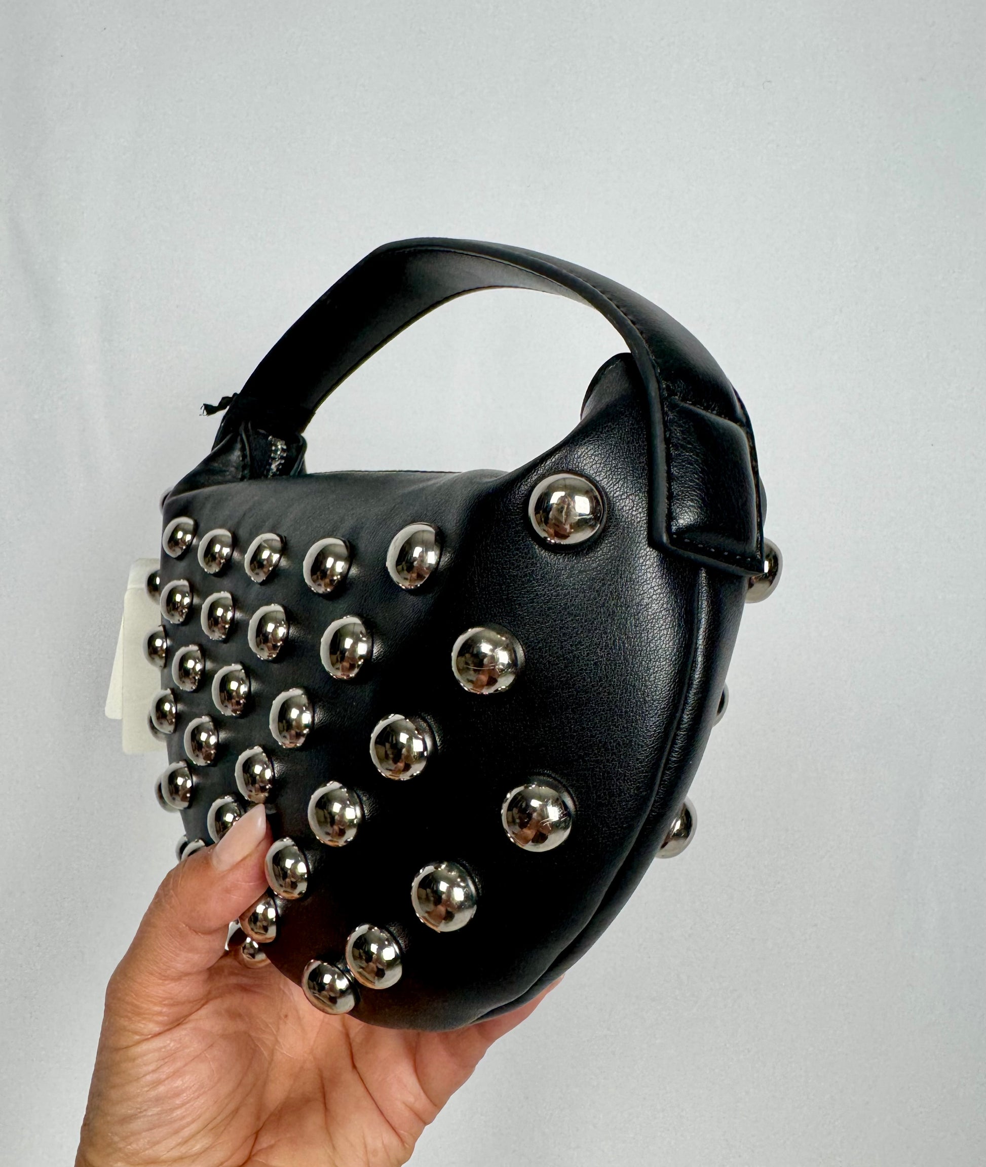Borsa Croissant a mano in ecopelle con borchie in metallo lucido applicate, chiusura con cerniera, dettaglio logo Vicolo laserato, finiture anticate color argento, tasca interna con cerniera e taschina piatta.