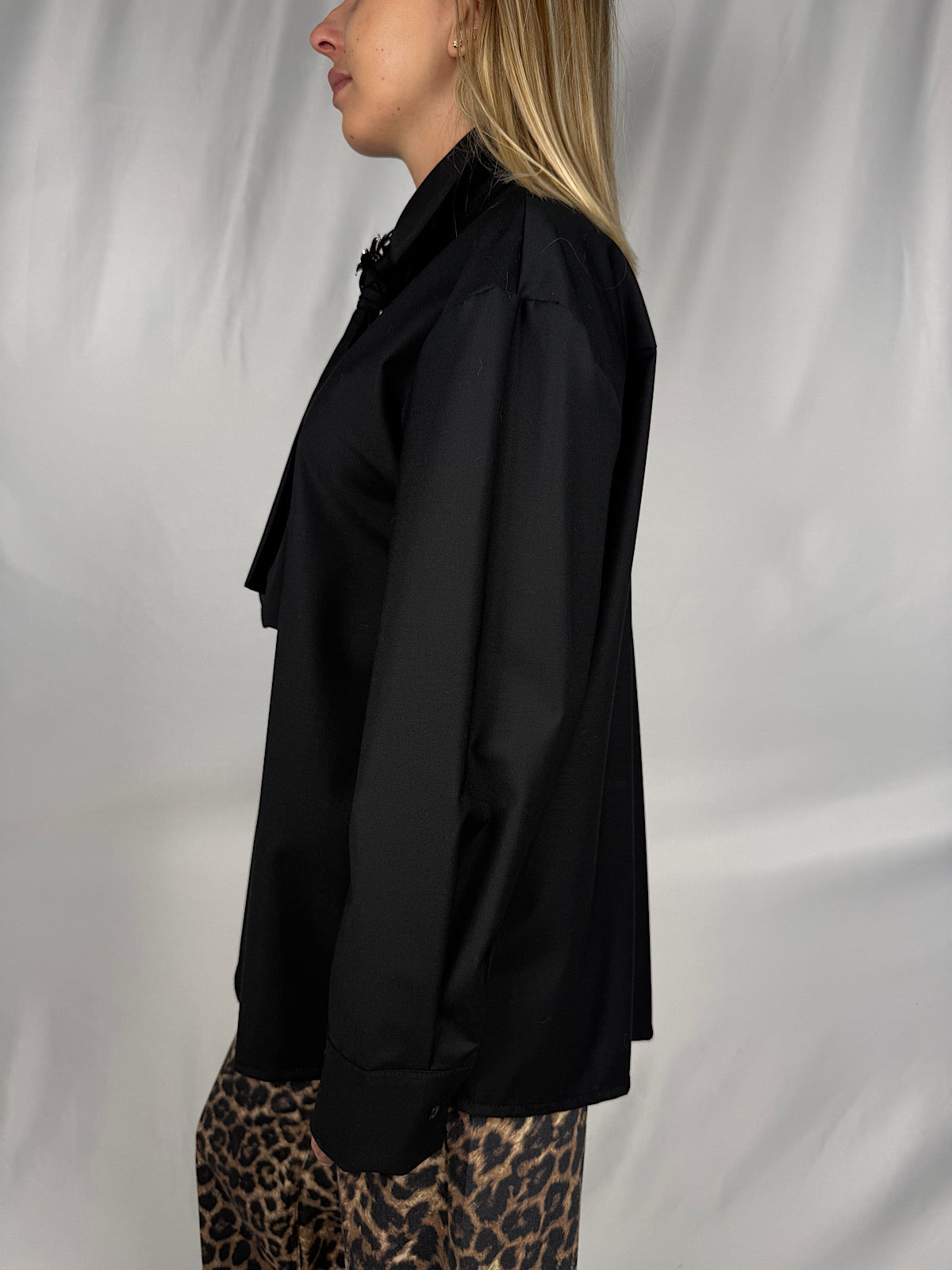 Camicia con cravatta con bottone gioiello argento.
