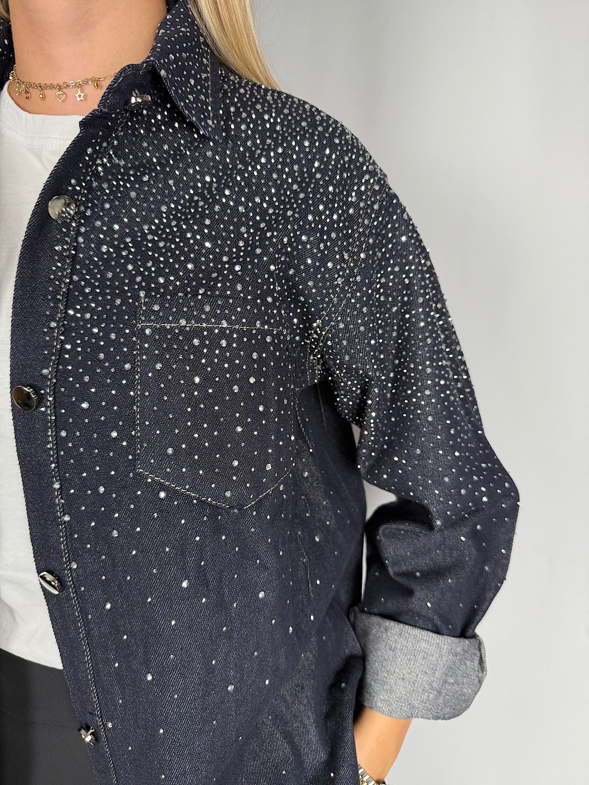 Camicia denim blu scuro con strass a cascata, colletto decorato, chiusura a bottoni.