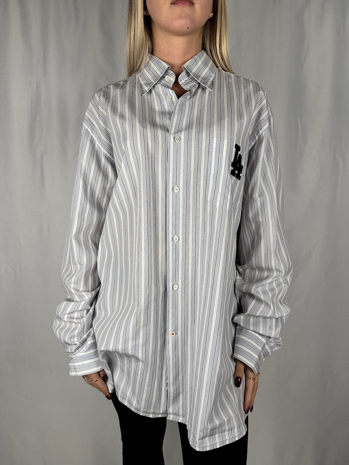 Camicia lunga a righe azzurre e bianche, con logo frontale e posteriore con cabochon.