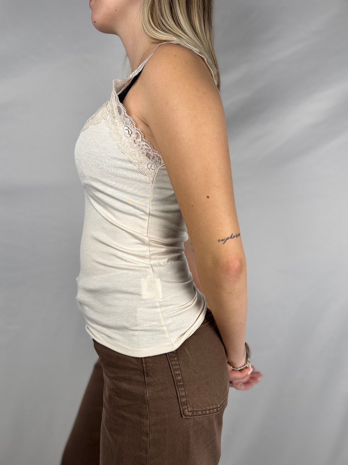 Canotta spalla larga elasticizzata scollo V con pizzo.