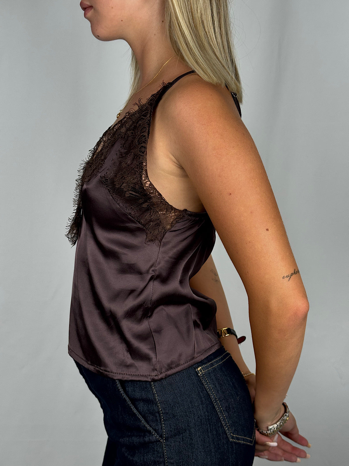 Top in raso con spalline sottili e regolabili. Dettagli in pizzo trasparente.