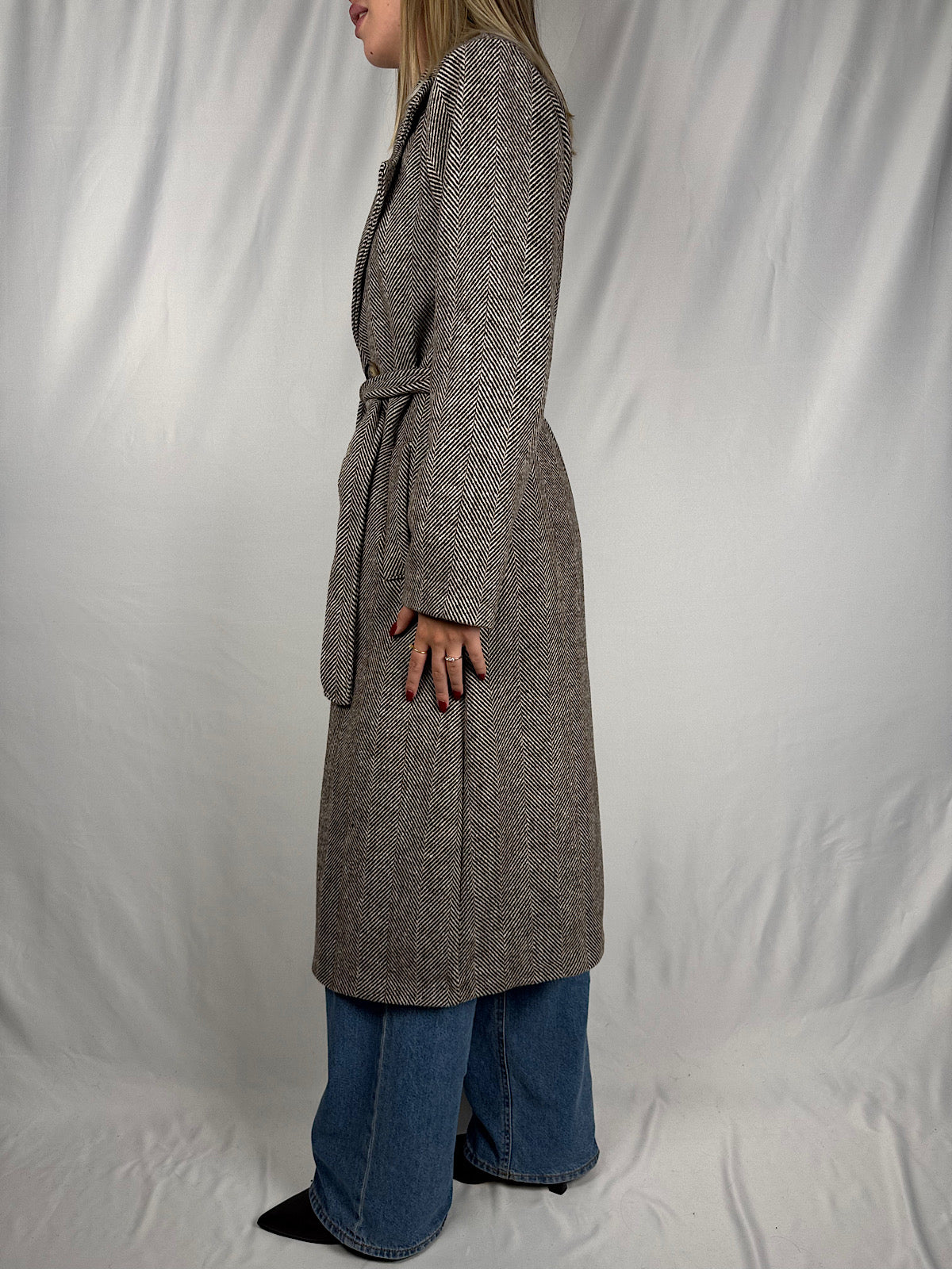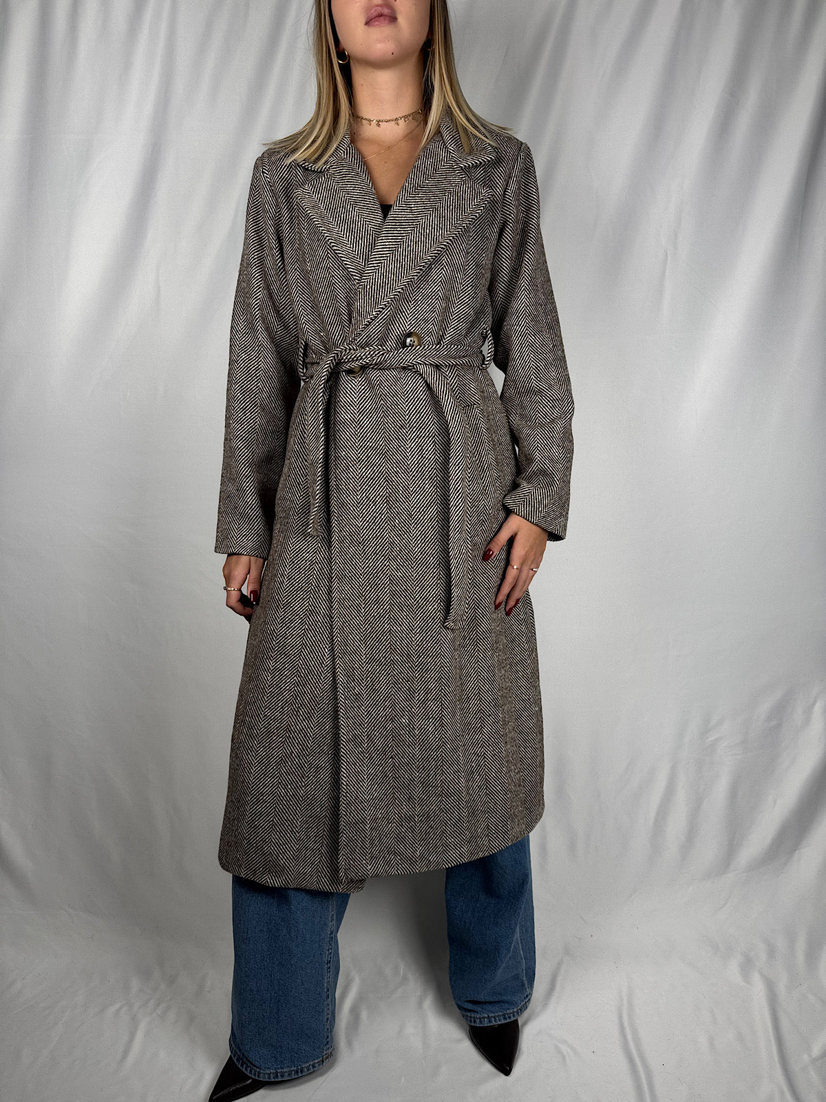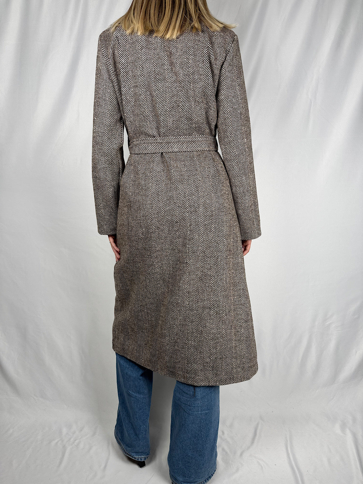 Capotto Lungo con Cintura Spigato Marrone Armonia