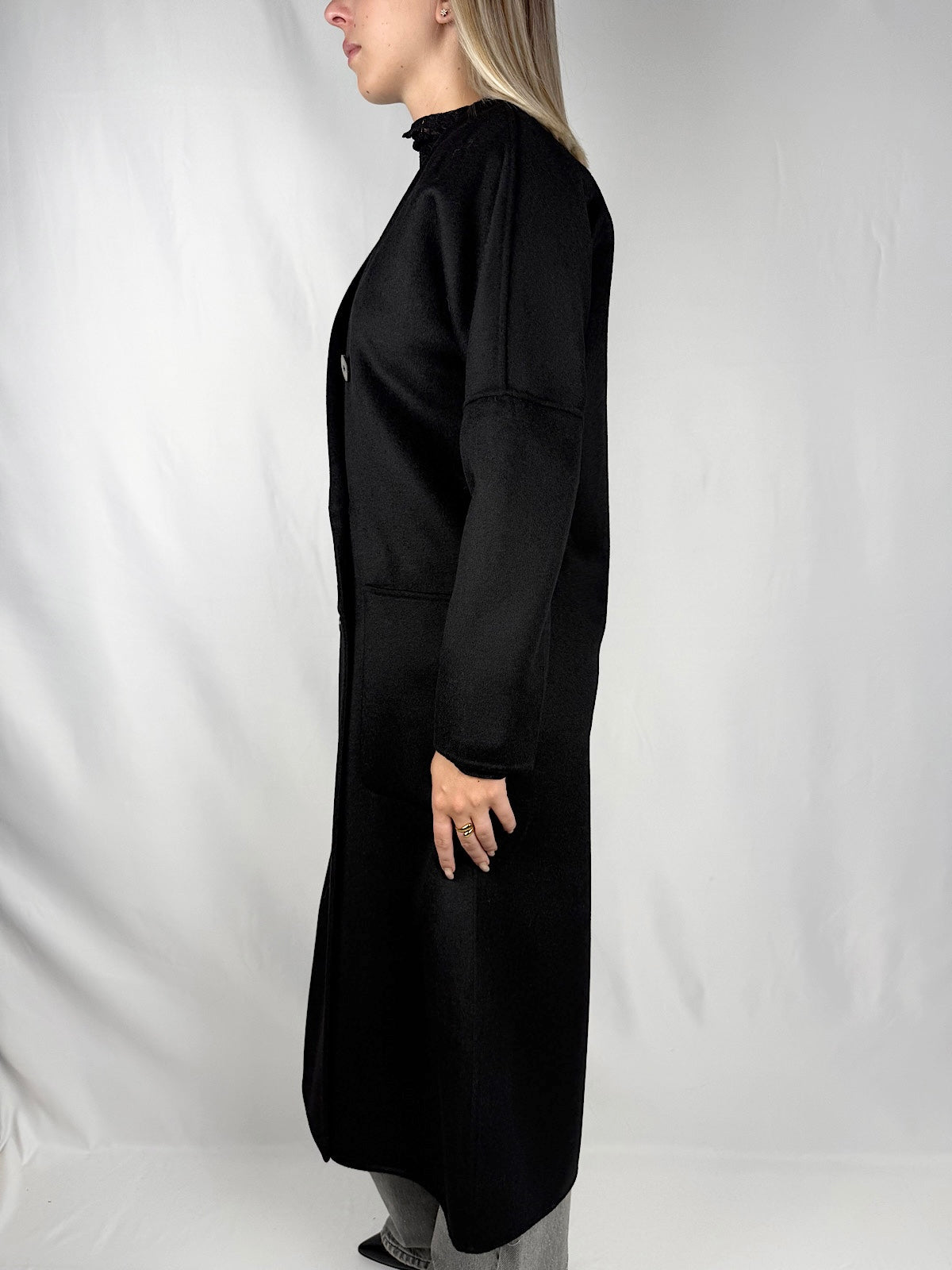 Cappotto lungo nero con bottoni a chiusura frontale.