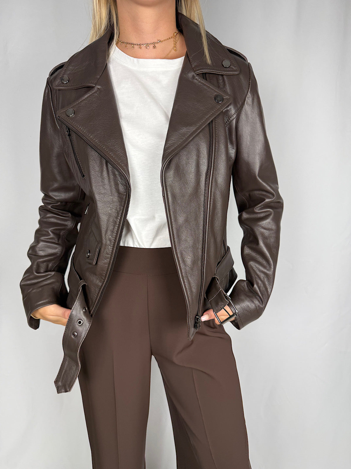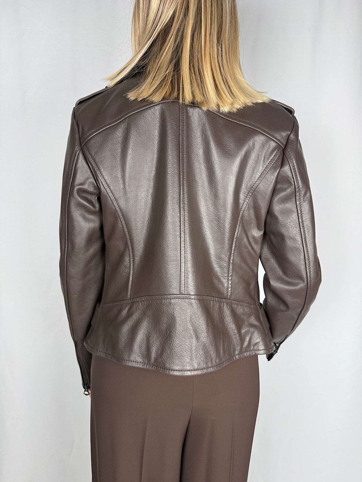 Chiodo in pelle con collo a revers e maniche lunghe. Tasche anteriori con cerniera metallica.