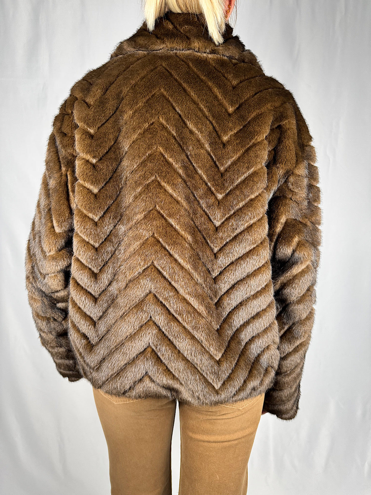 Giacca eco-pelliccia presenta una lavorazione chevron, chiusura a zip, tasche a filo e elastico regolabile sul fondo per una vestibilità personalizzata.