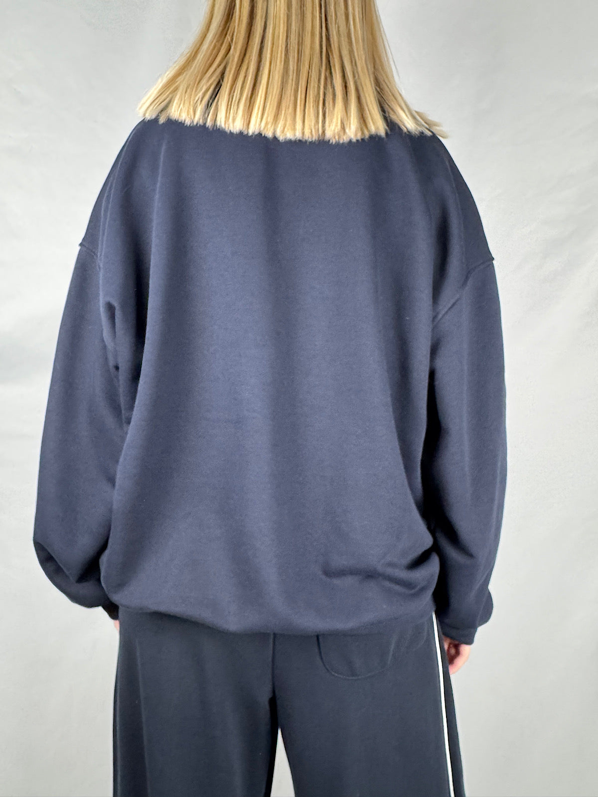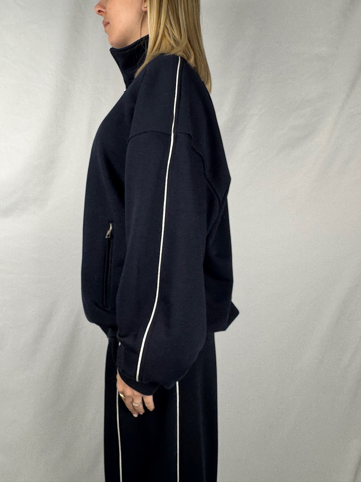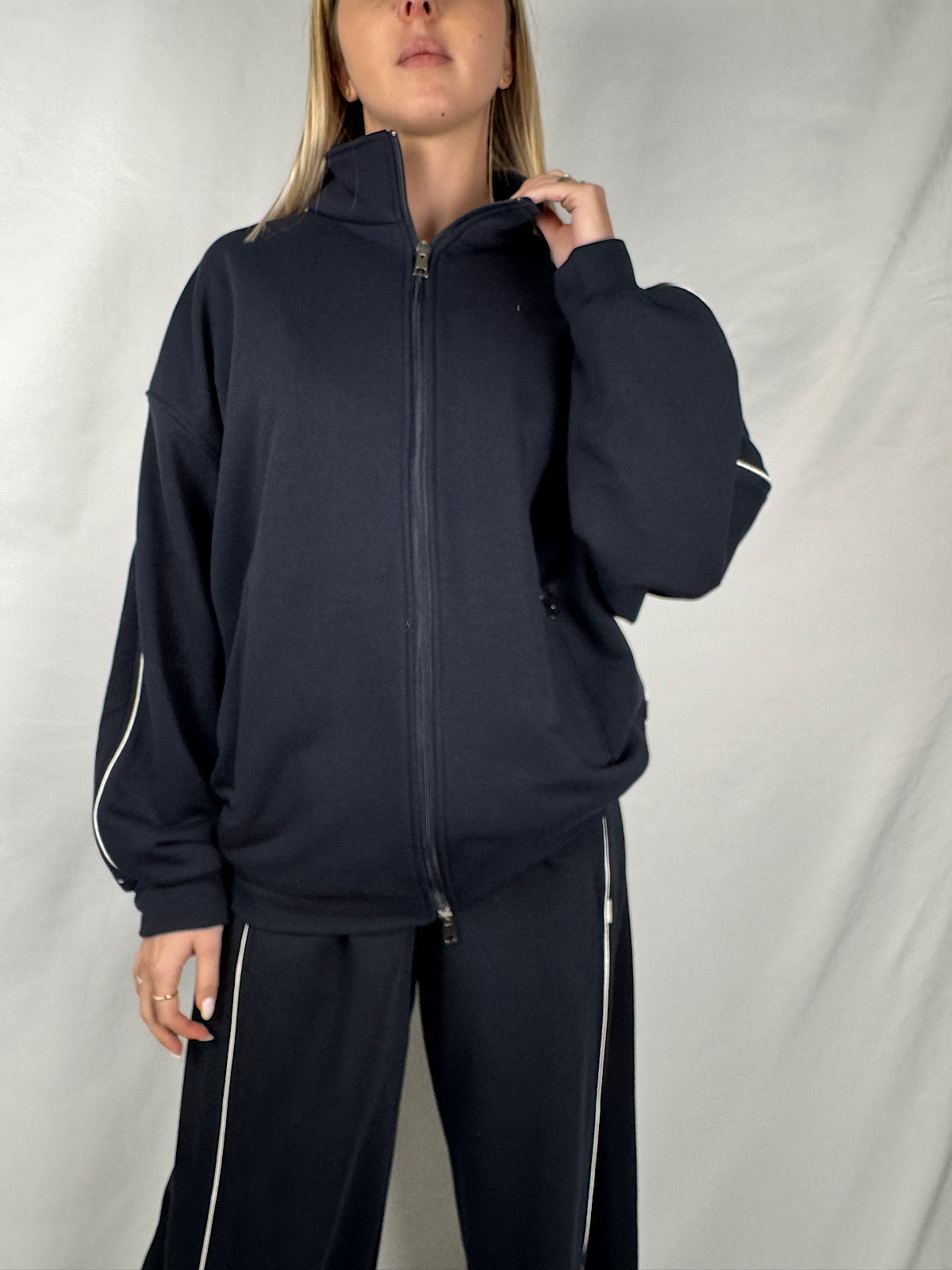 Modello fit morbido con chiusura zip frontale. Dettaglio di riga bianca a contrasto e collo alto.