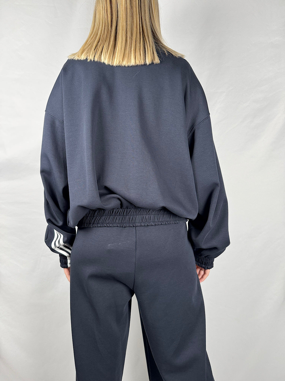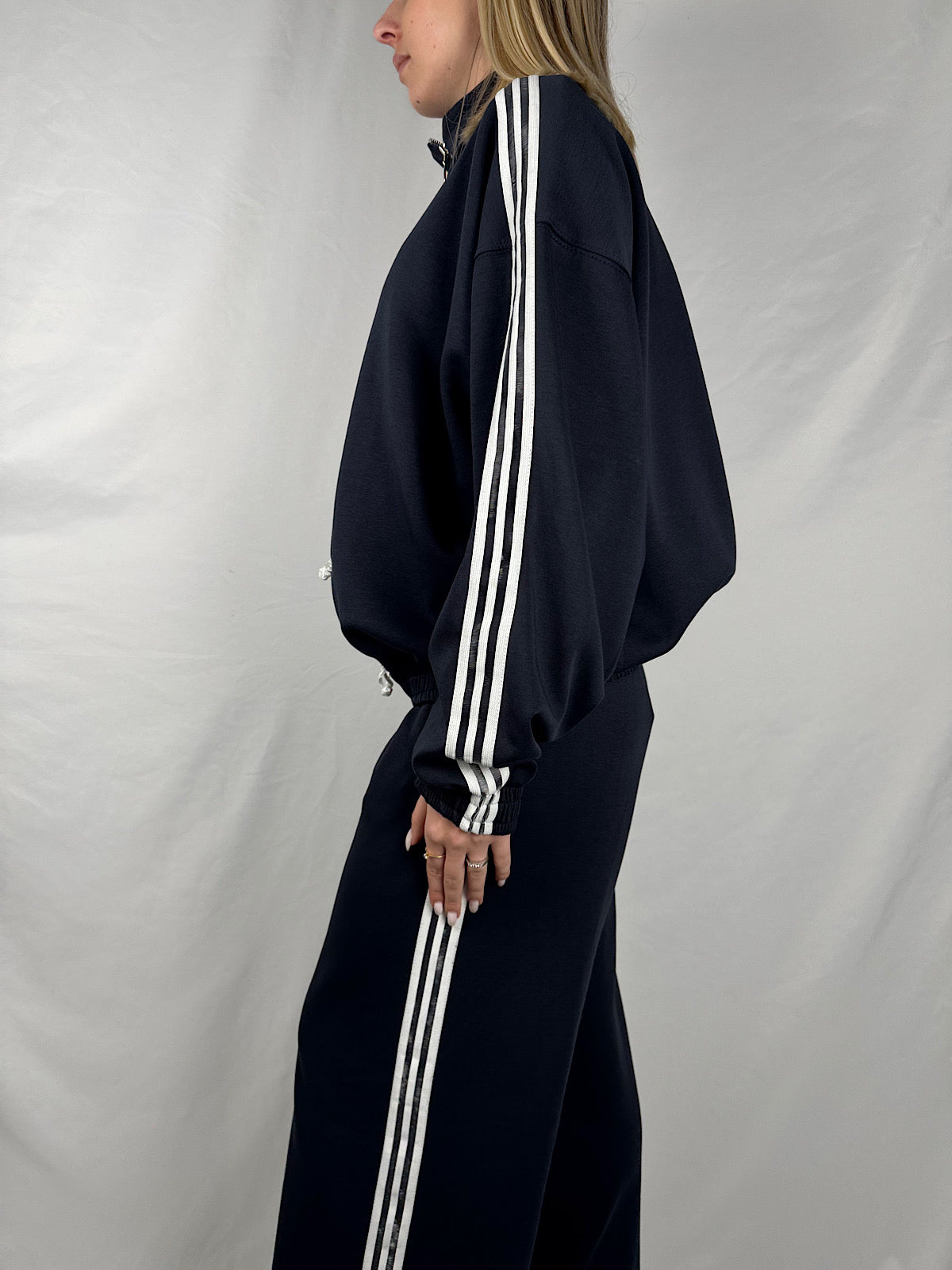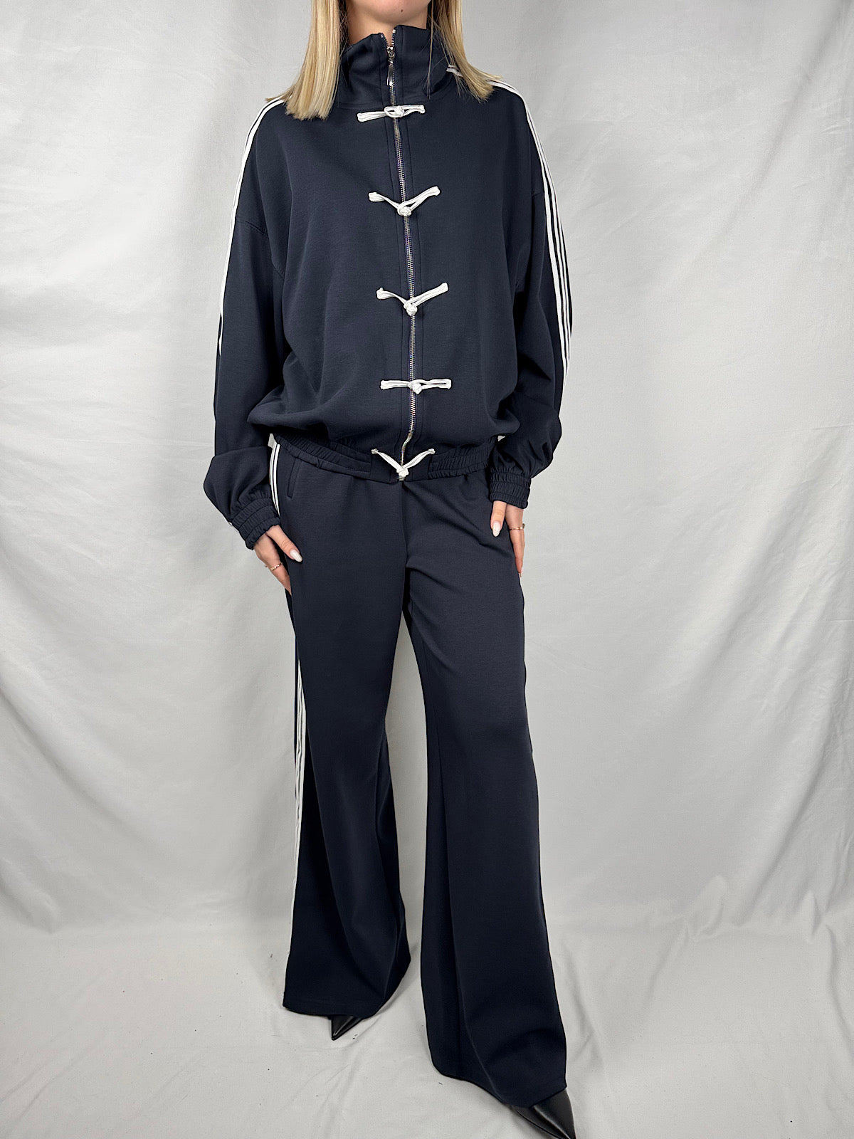 Felpa con colletto e chiusura zip frontale, dettaglio alamari frontali, elastico arricciato sul fondo, bande sportive laterali.