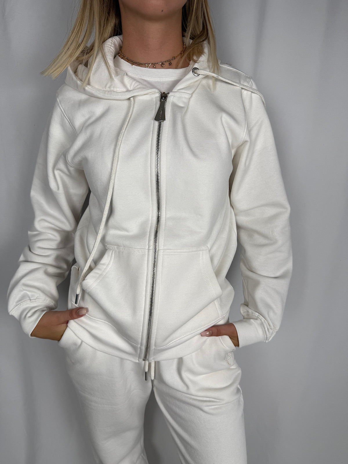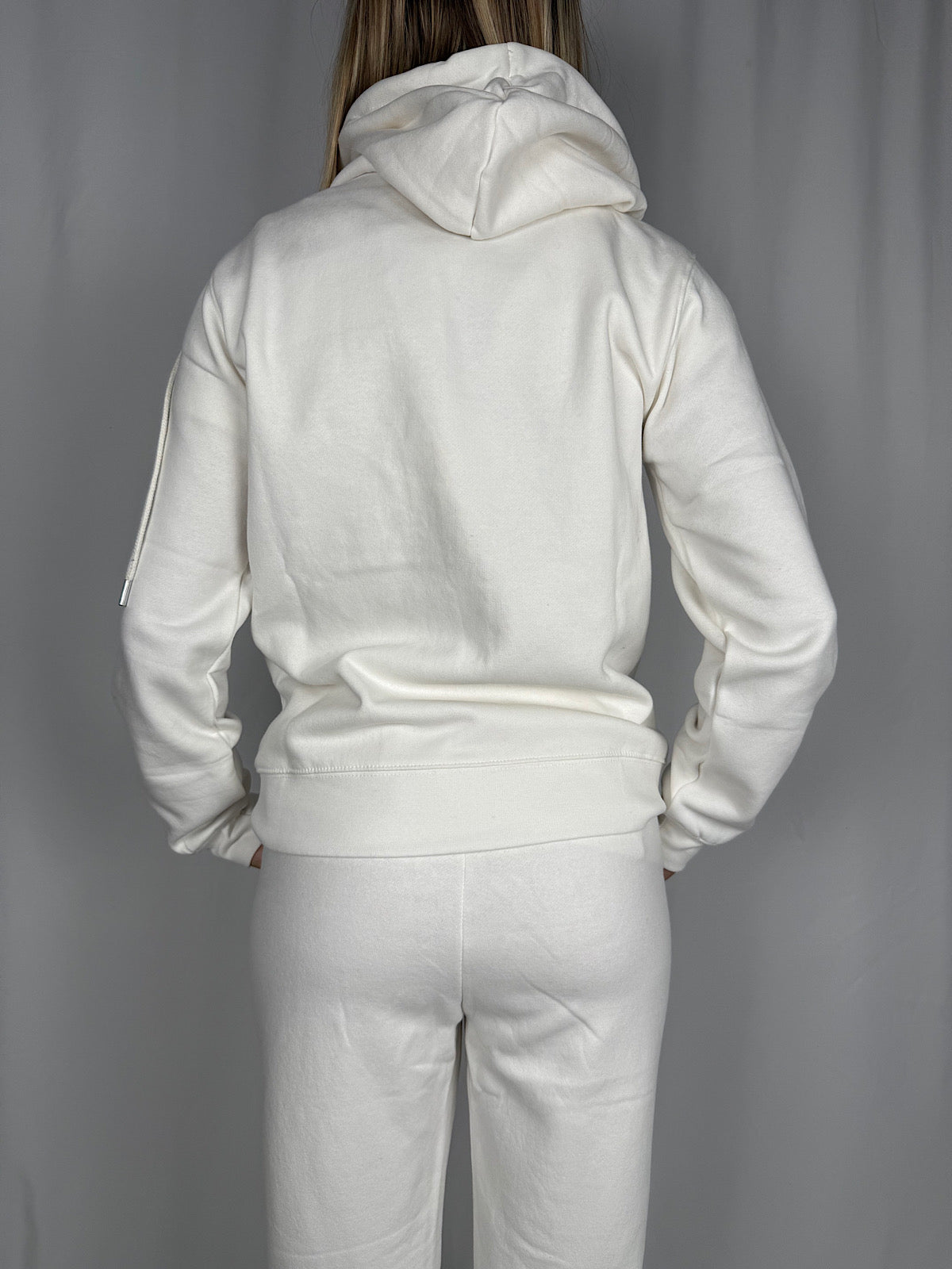 Felpa bianca con cappuccio regolabile, chiusura a zip con tasche. Dettaglio ricamo sulla manica.