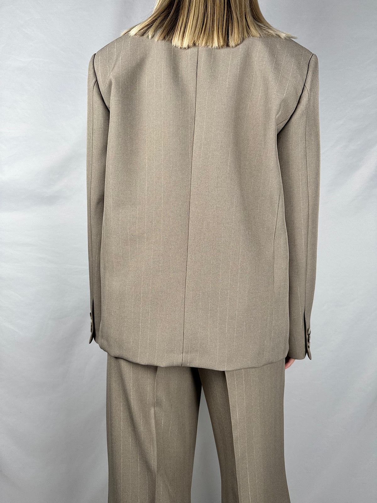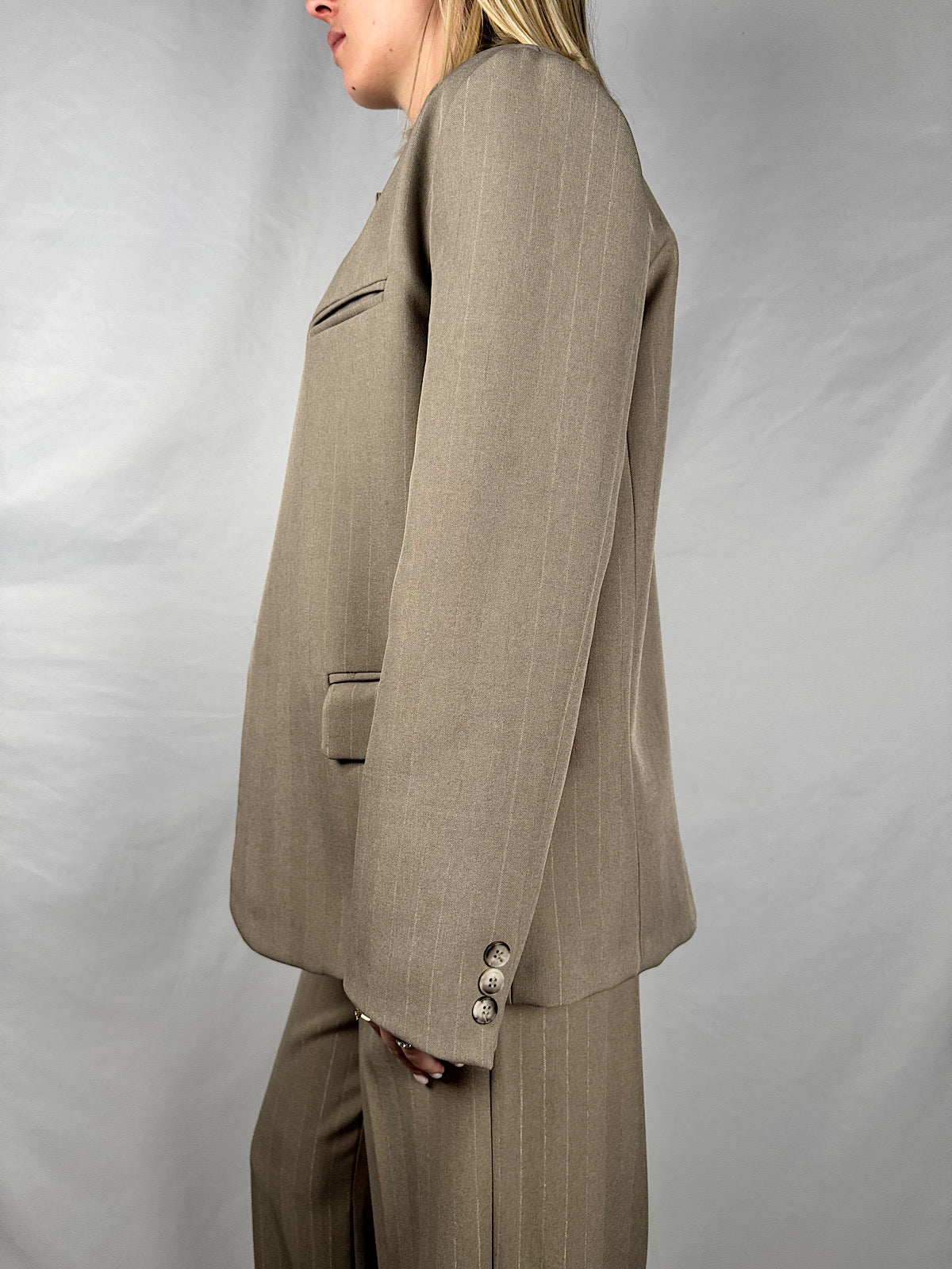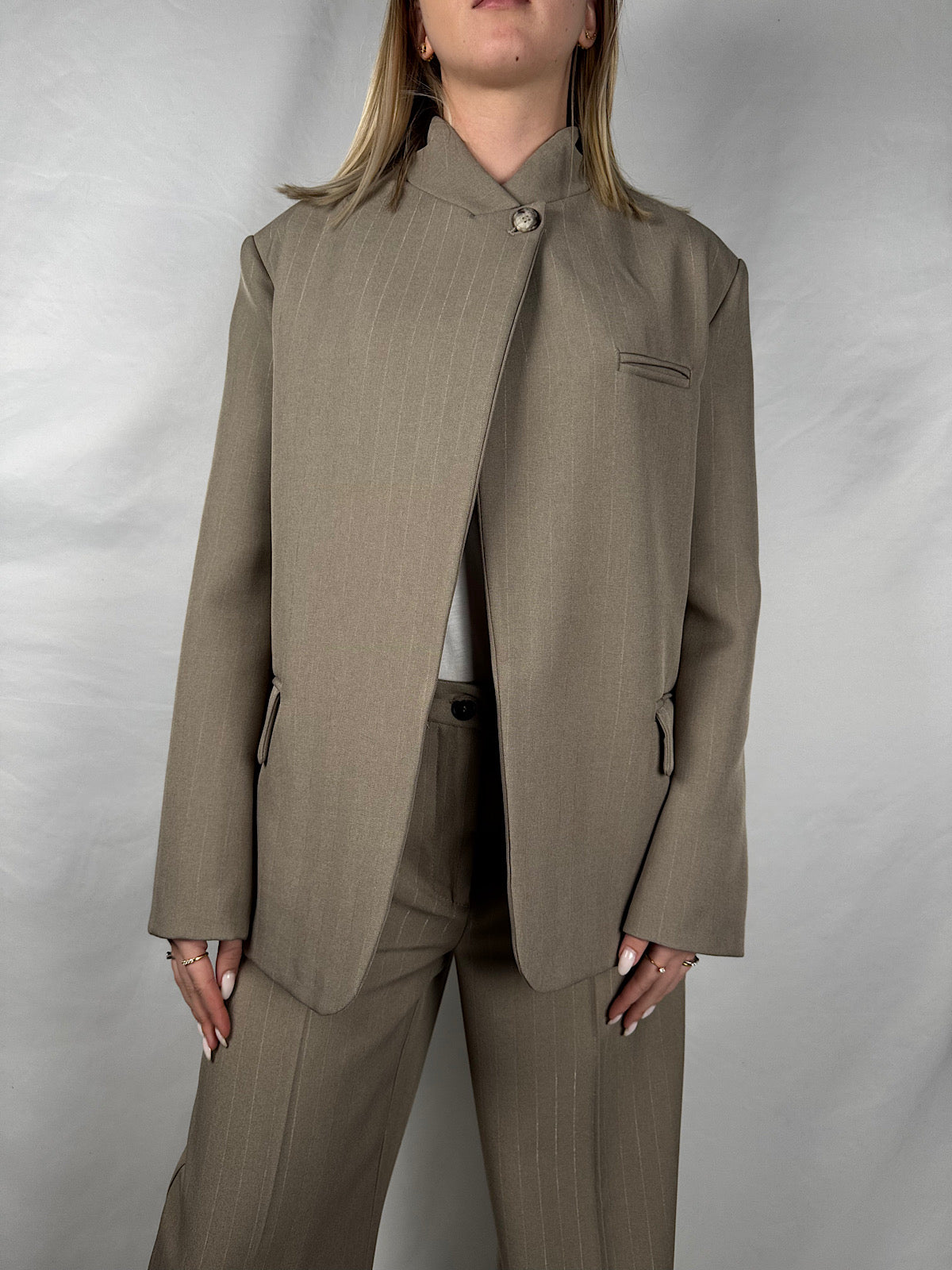 Blazer a collo alto maniche lunghe con spacco frontale. Chiusura con un bottone tartarugato alto. Tasche a filetto sul petto e tasche a pattina frontali. Dettaglio tessuto gessato.
