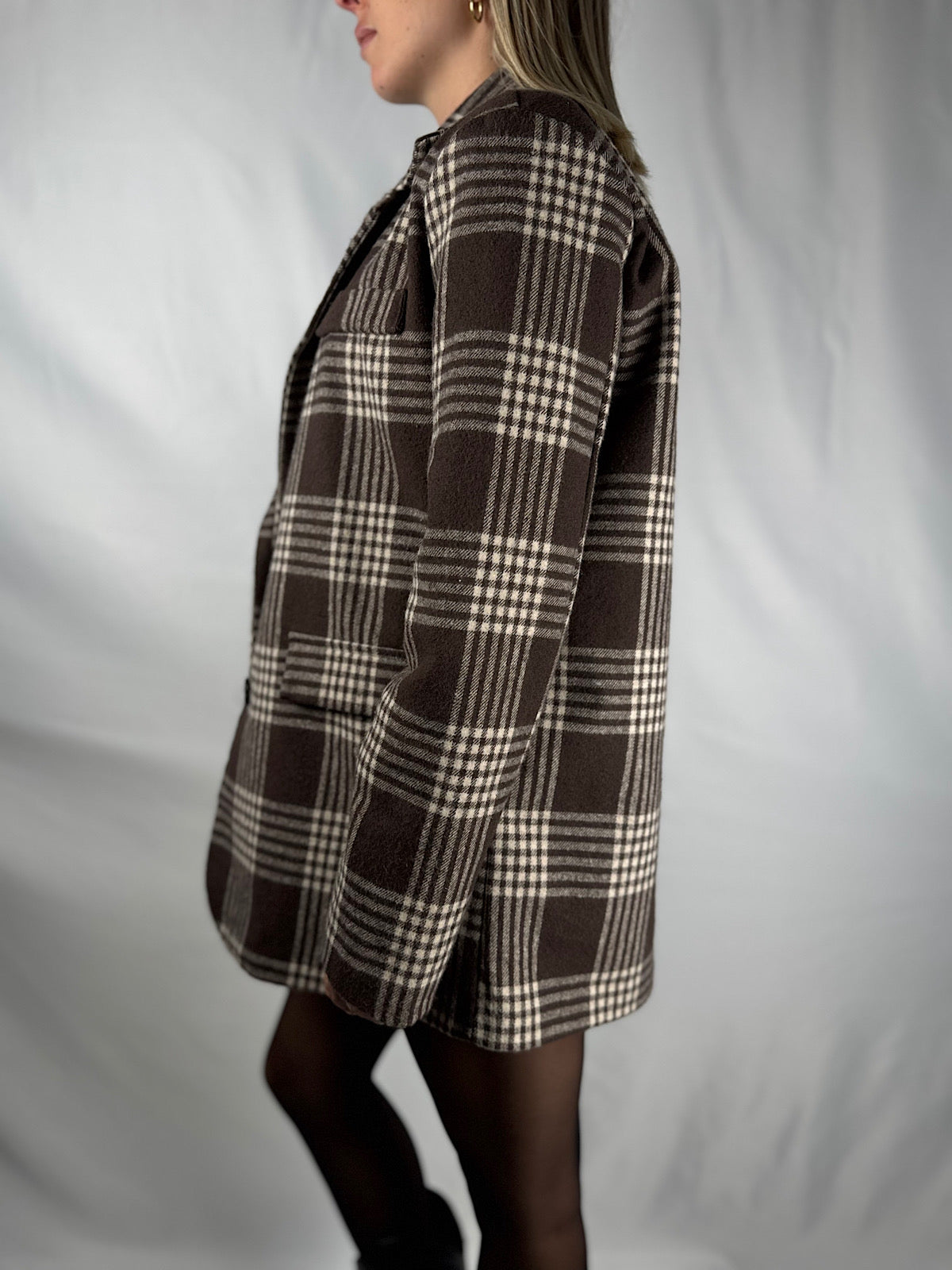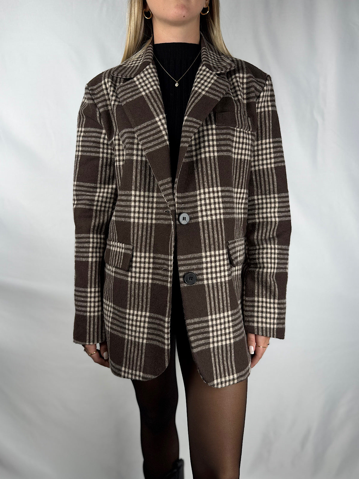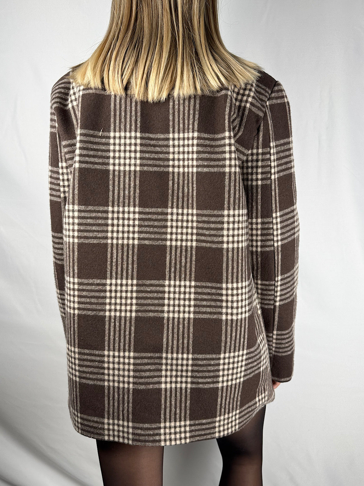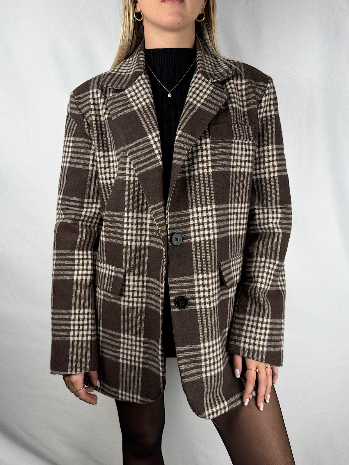 Blazer con collo a revers e maniche lunghe. Tasche frontali a pattina. Chiusura monopetto con due bottoni. Tessuto in fantasia check.