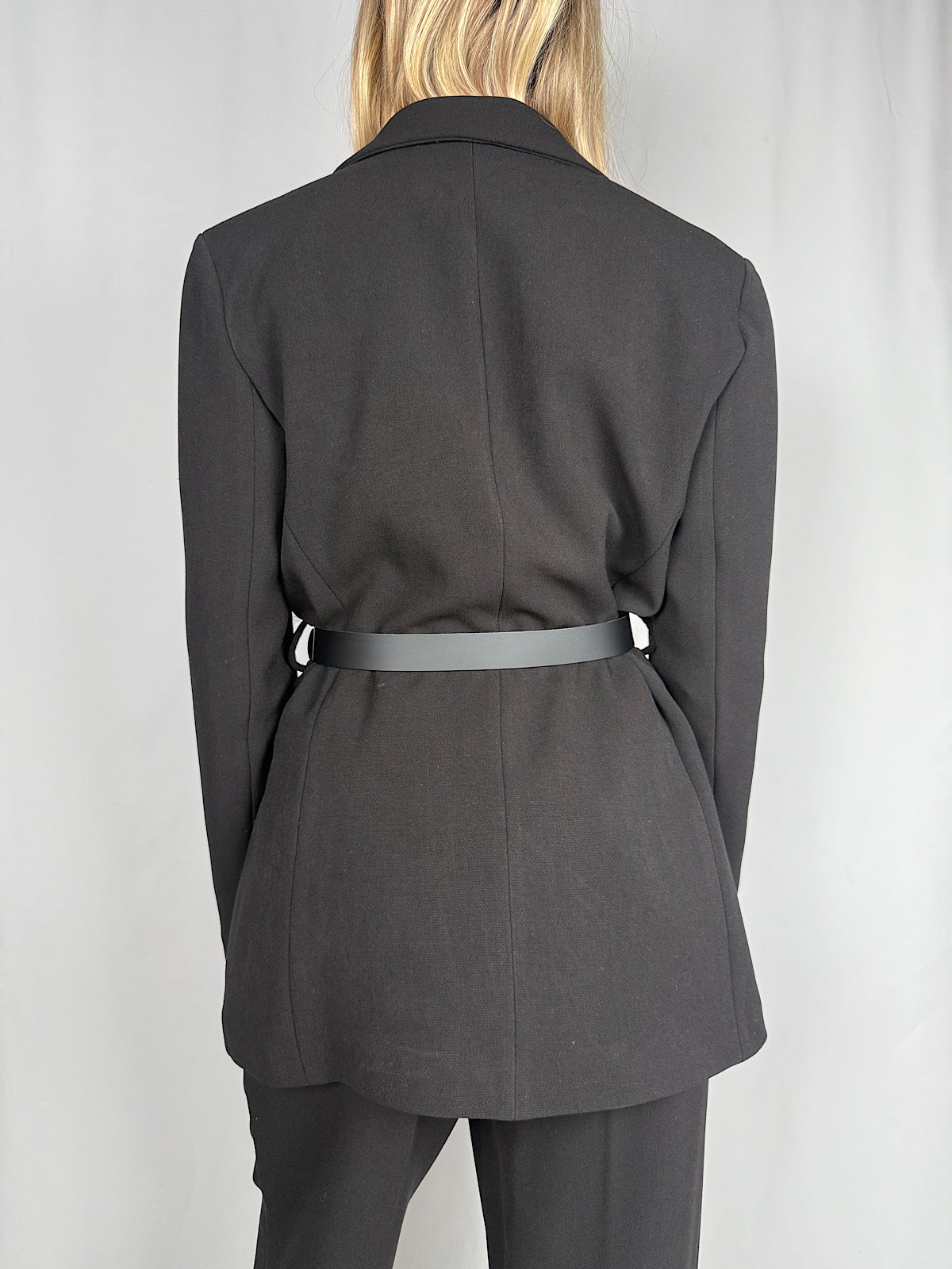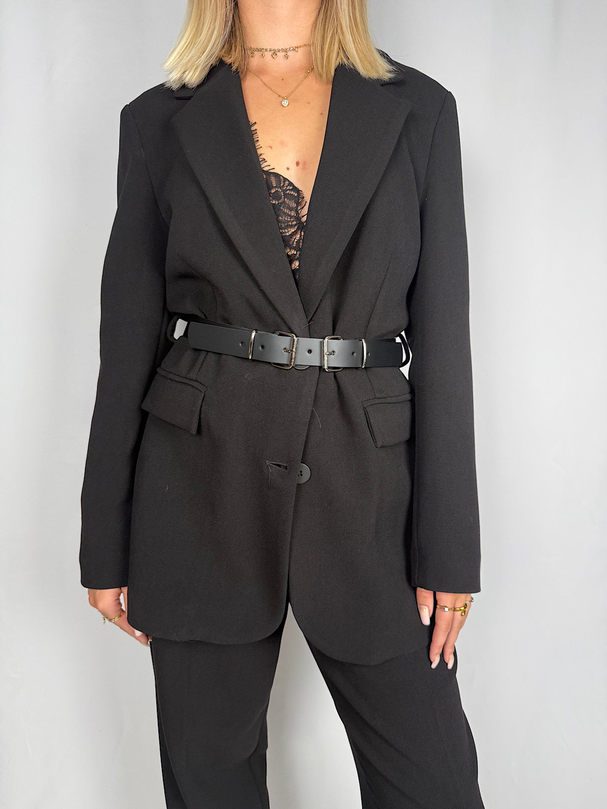 Giacca monopetto Tensione-in con cintura nera in doppia fibbia.