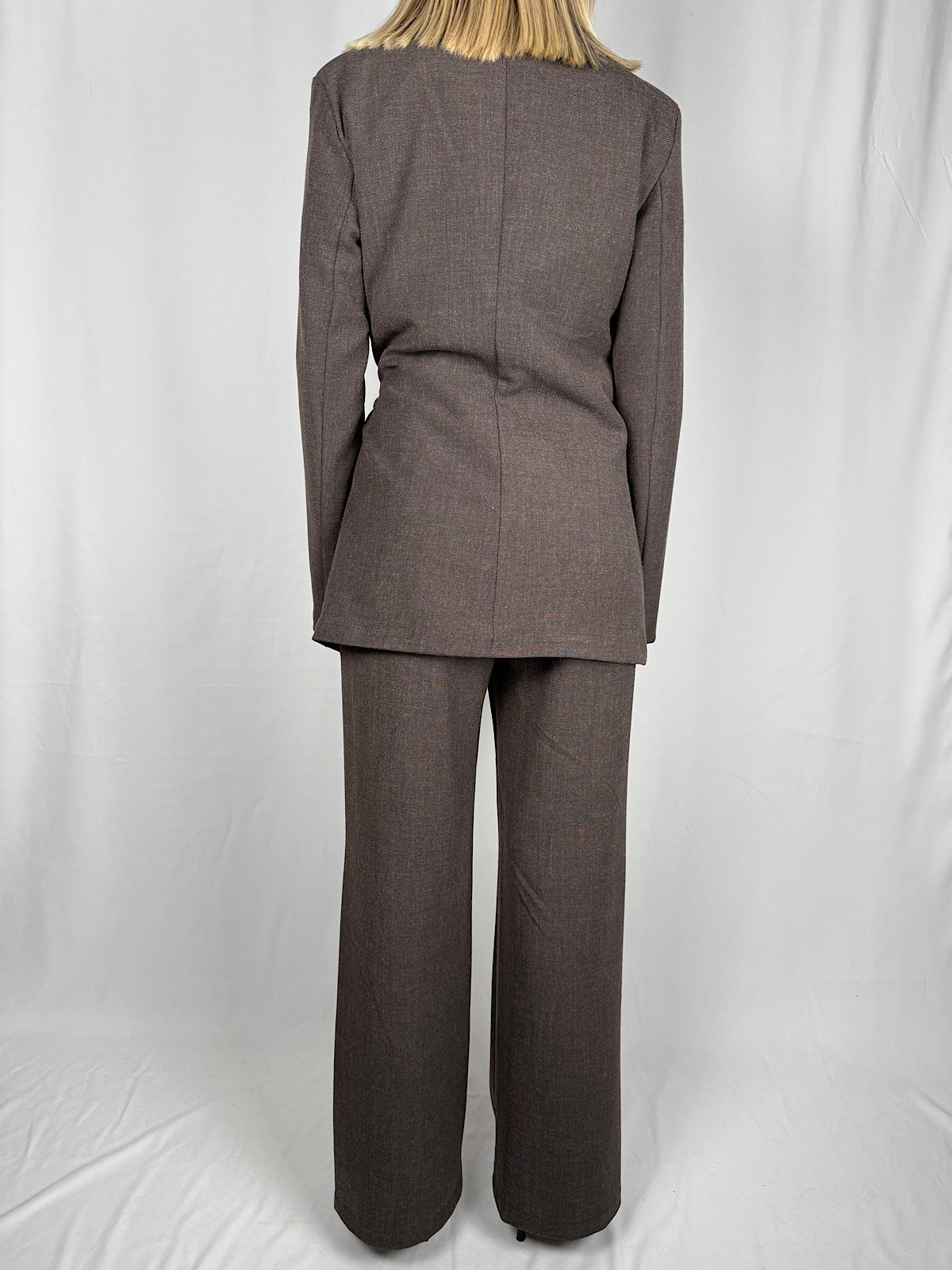 Blazer maniche lunghe revers sul collo. Finte tasche frontali con patta . Chiusura doppiopetto con cintura.