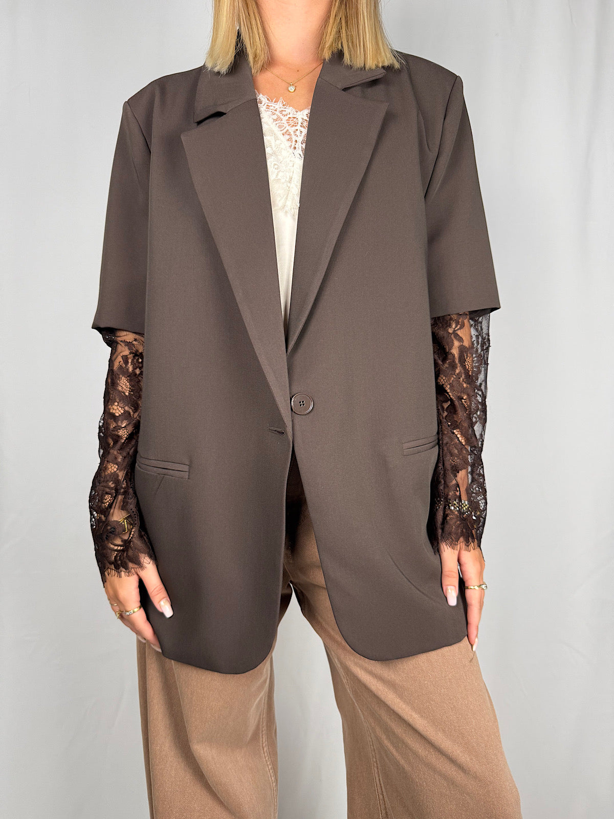 Blazer oversize monopetto manica corta con inserto cucito, manicotto in pizzo in tono su tono.