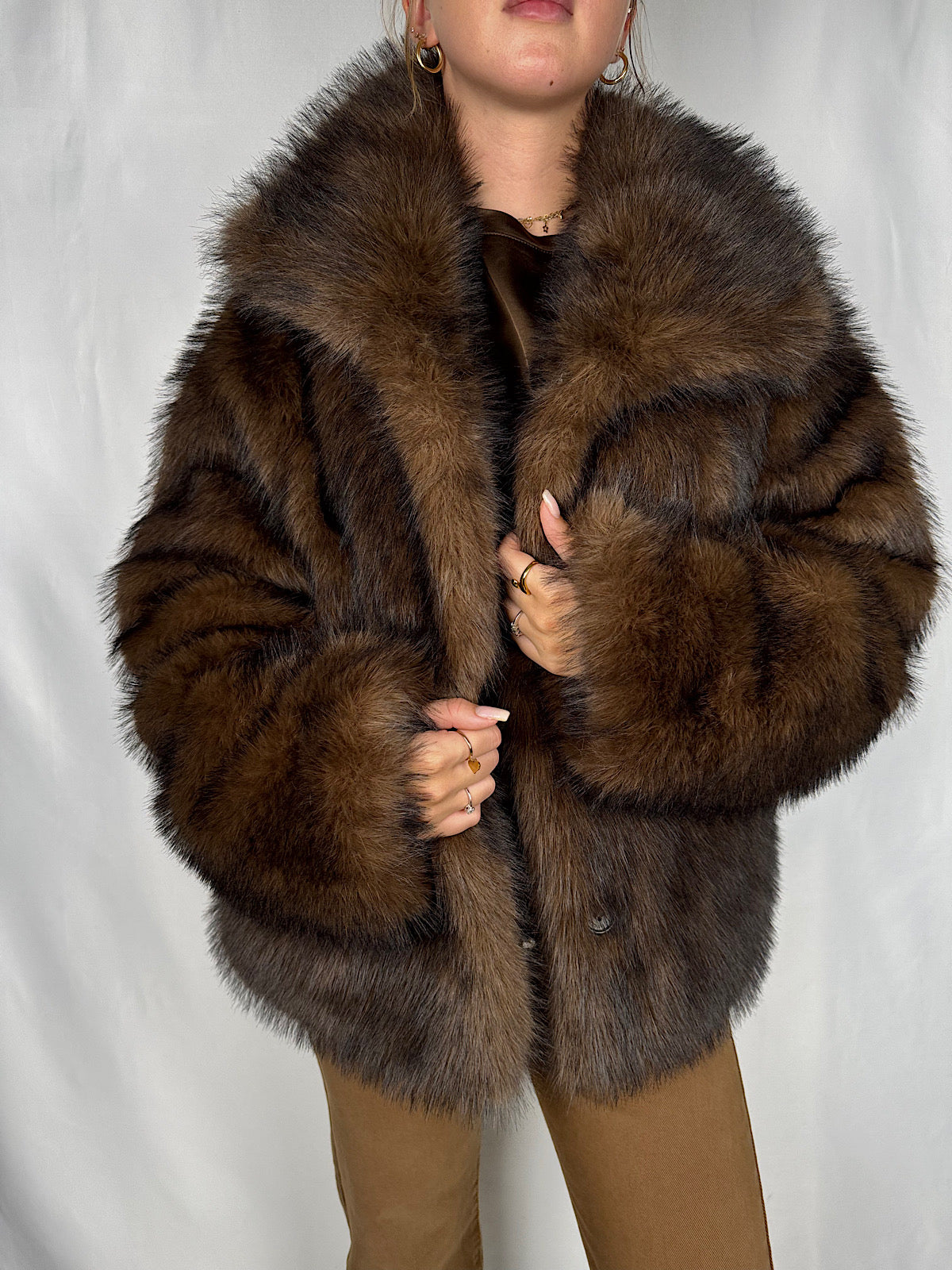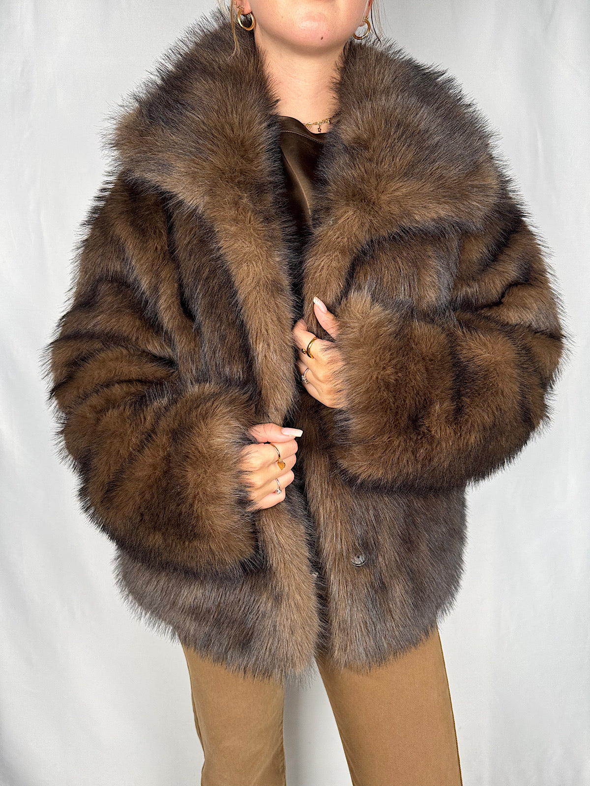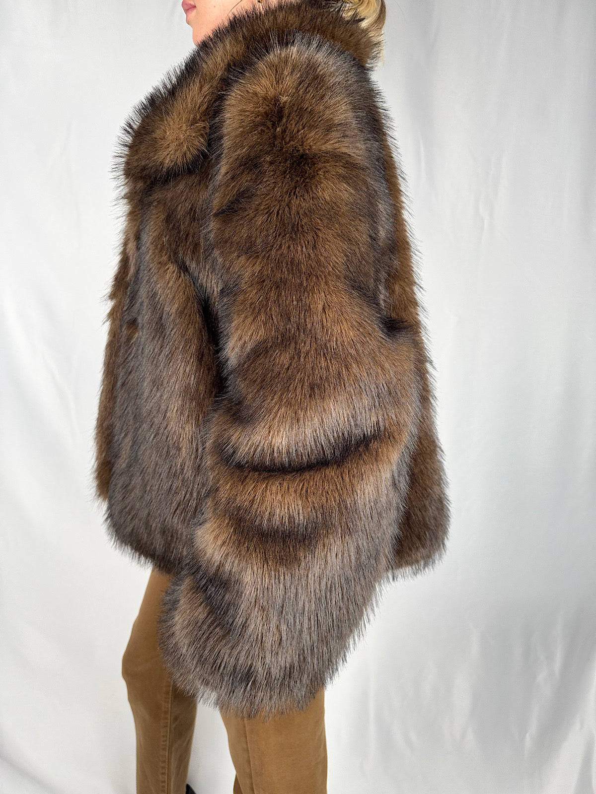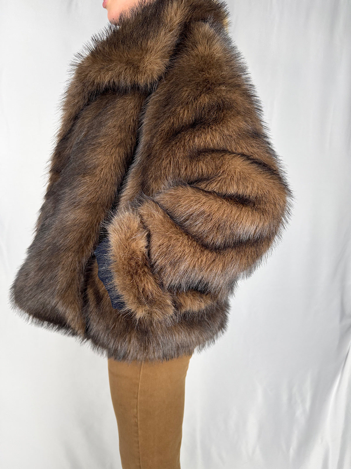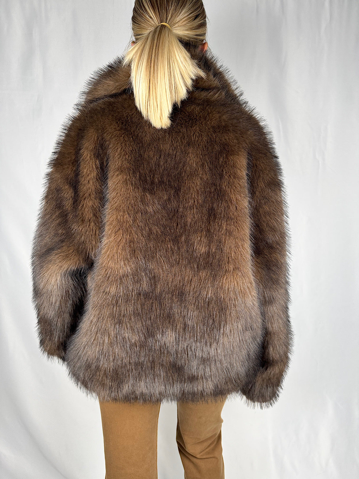 Ecopelliccia reversibile con interno in denim con collo rever e maniche lunghe. Tasche laterali. Chiusura frontale con bottonni. Il lato reversibile diventa una giacca in denim con dettagli in pelliccia.