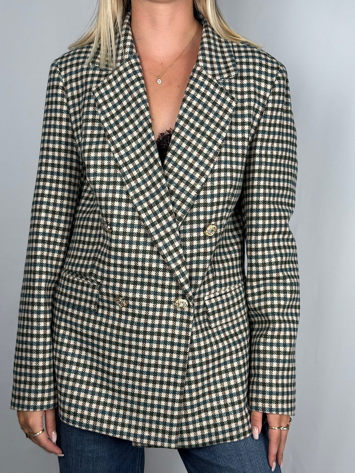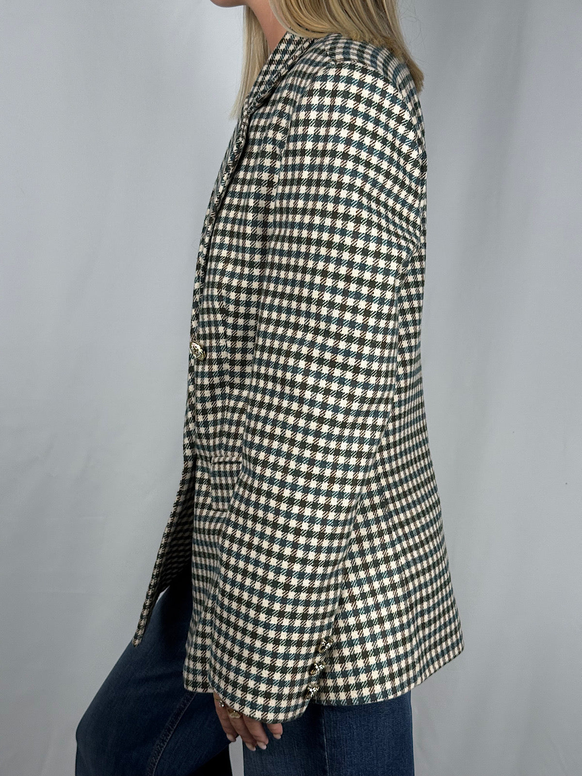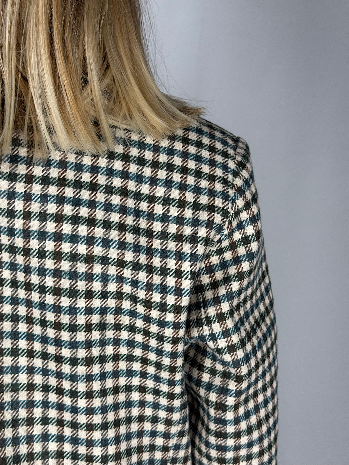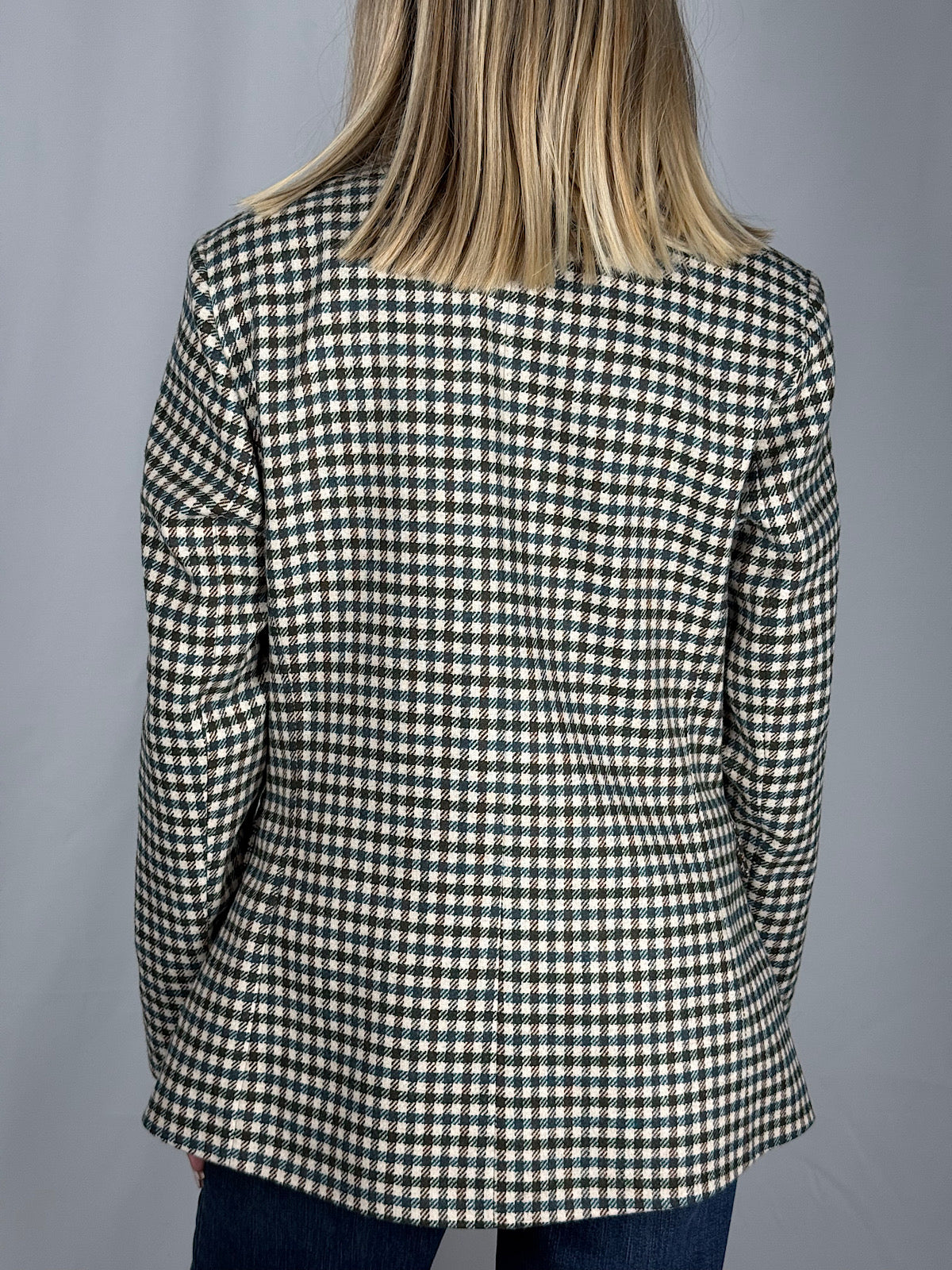 Blazer con colletto a revers. Maniche lunghe e tasche anteriori con patta. Chiusura frontale a doppiopetto due bottoni. Dettaglio tessuto fantasia check. Spacco sul retro.