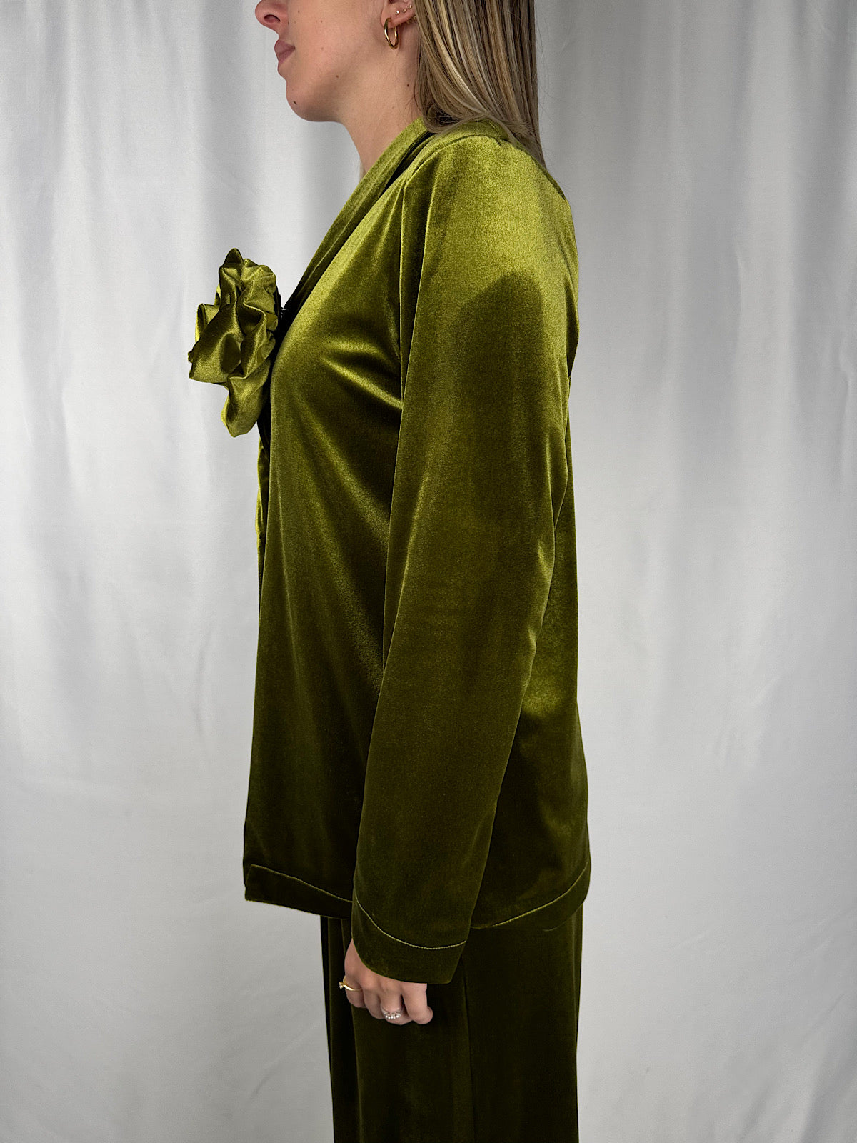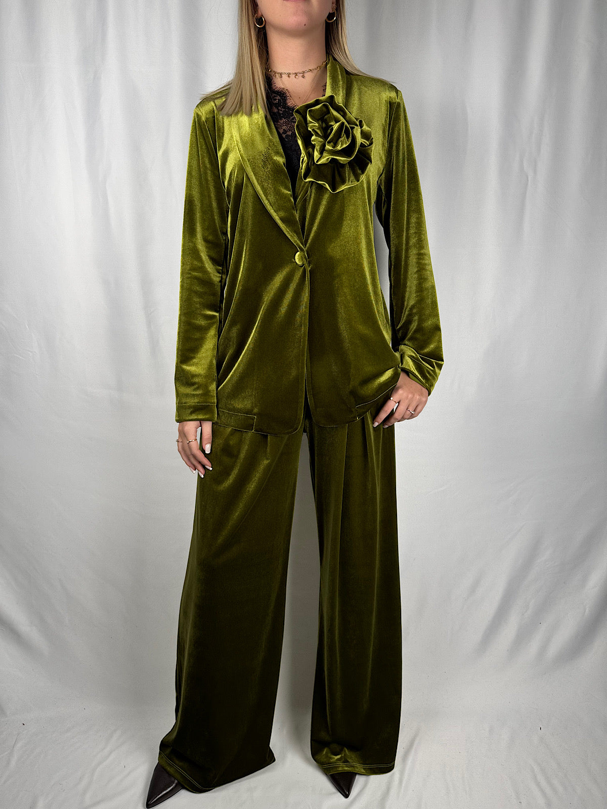 Giacca in velluto con chiusura a bottone. Spilla con rosa removibile