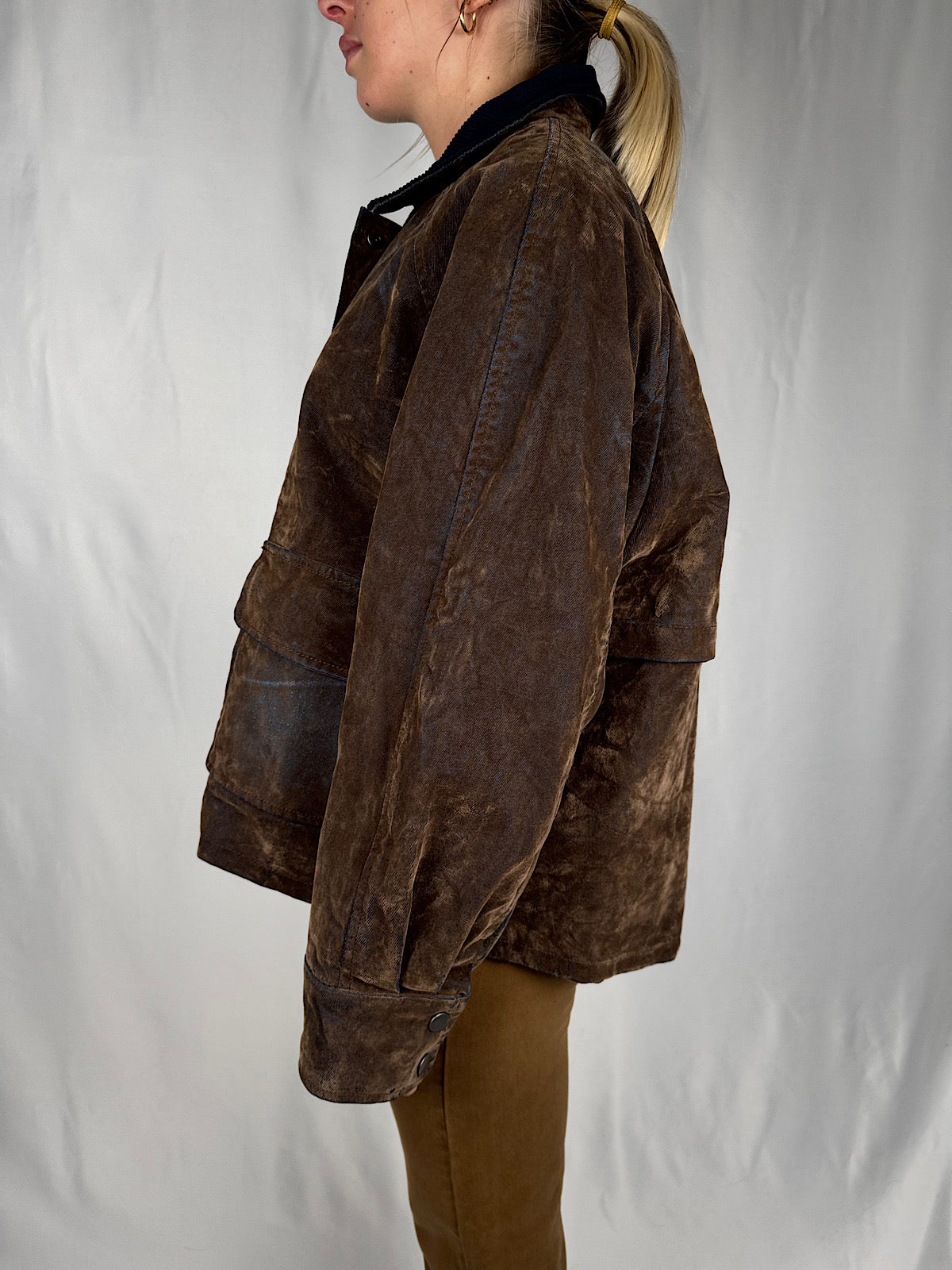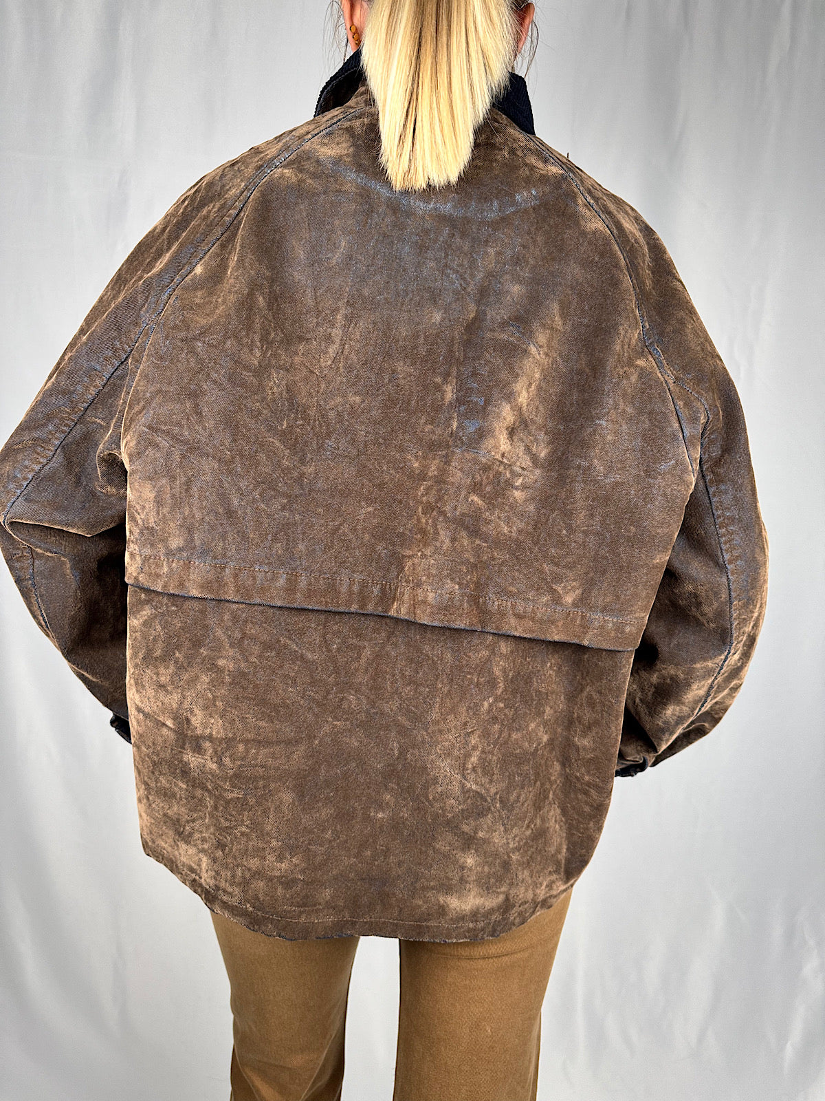 Giacca caratterizzata dalla texture floccata effetto velluto, colletto in velluto, tasche frontali applicate con pattine, bottoni a pressione sui polsini, chiusura con zip e bottoni metallici a pressione.
