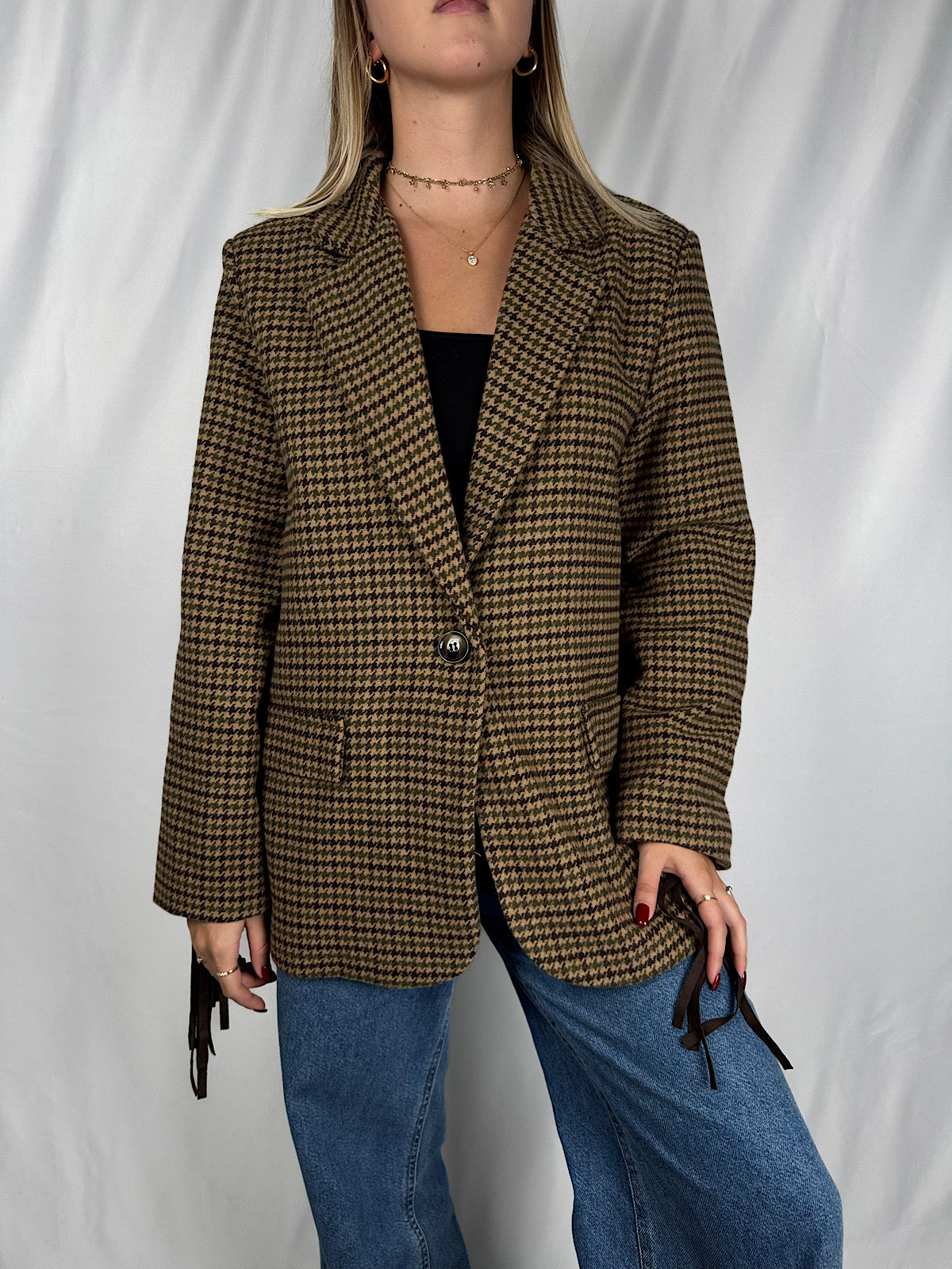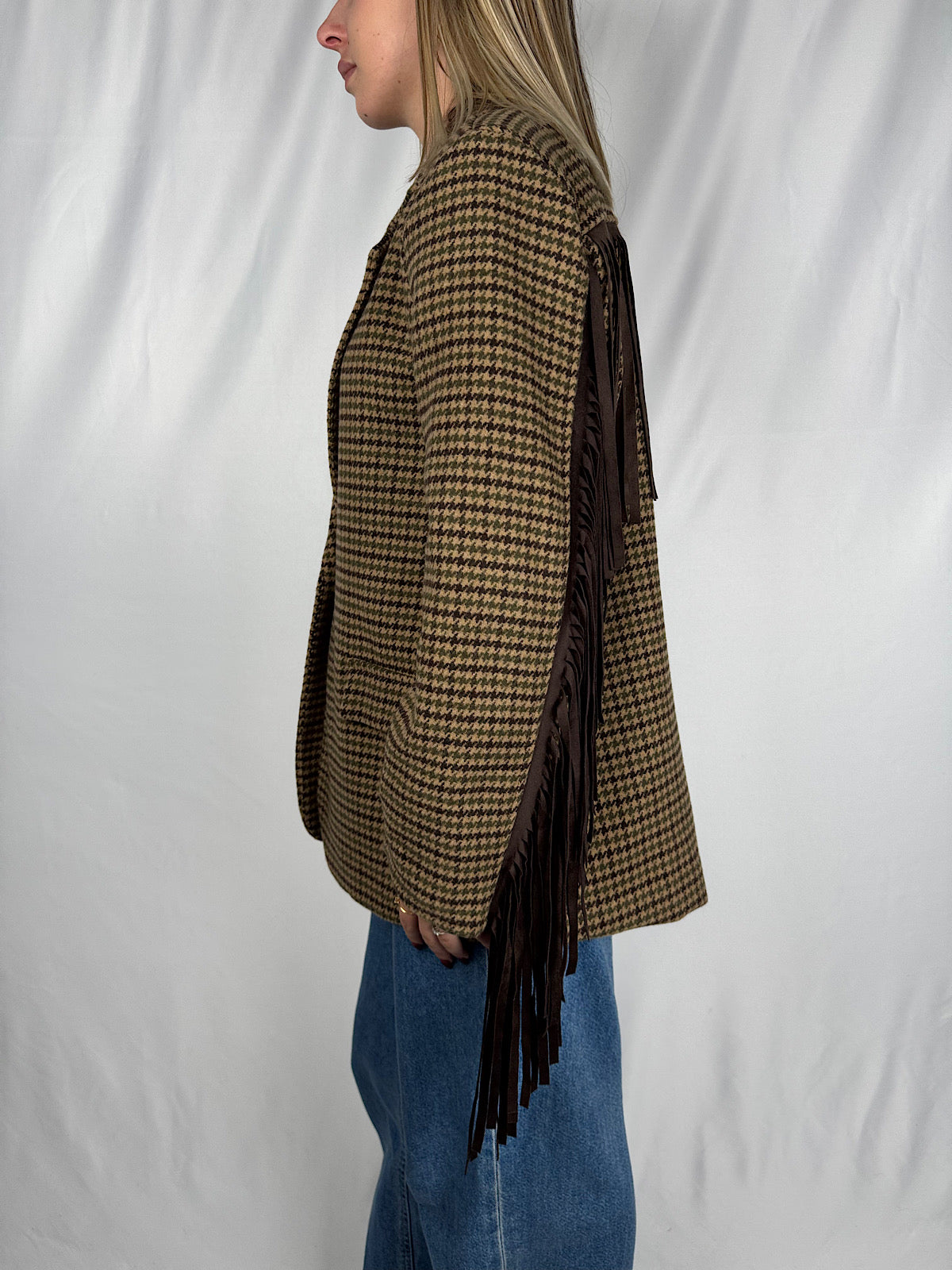 Giacca monopetto con chiusura a bottone e frange scamosciate marroni sul retro e maniche.