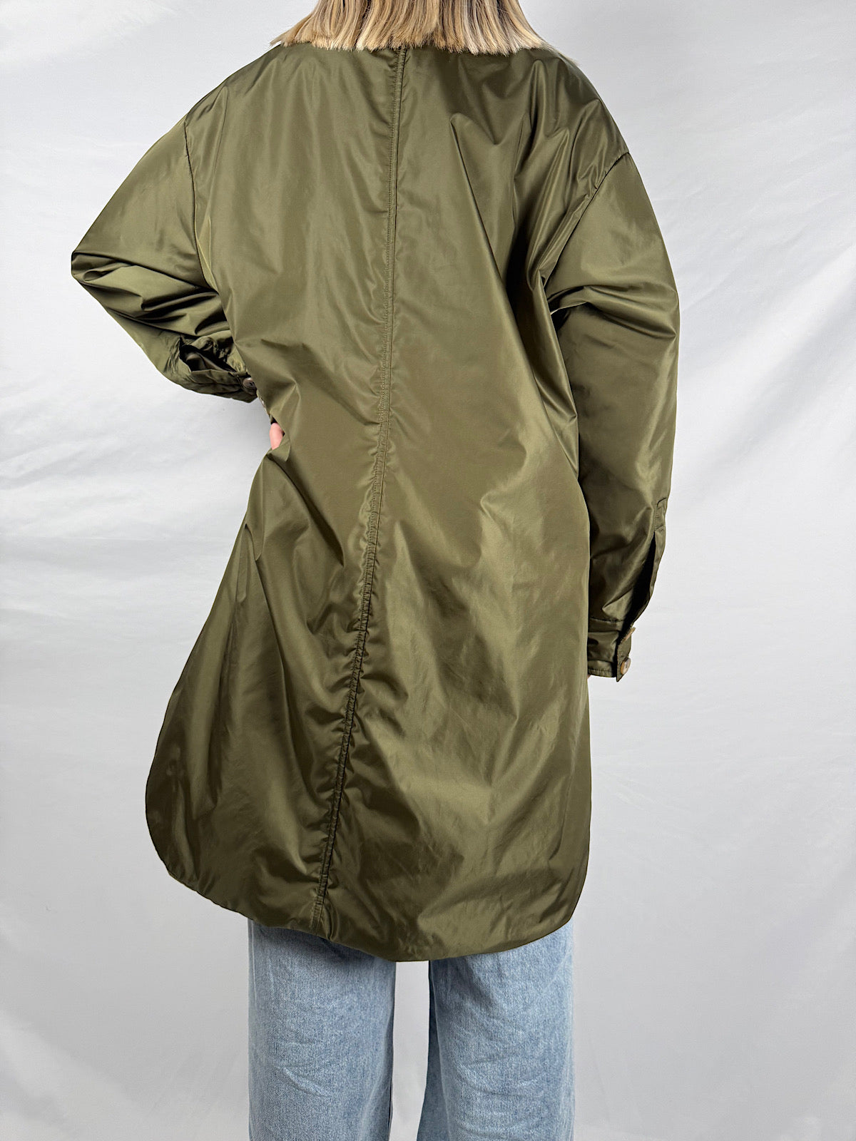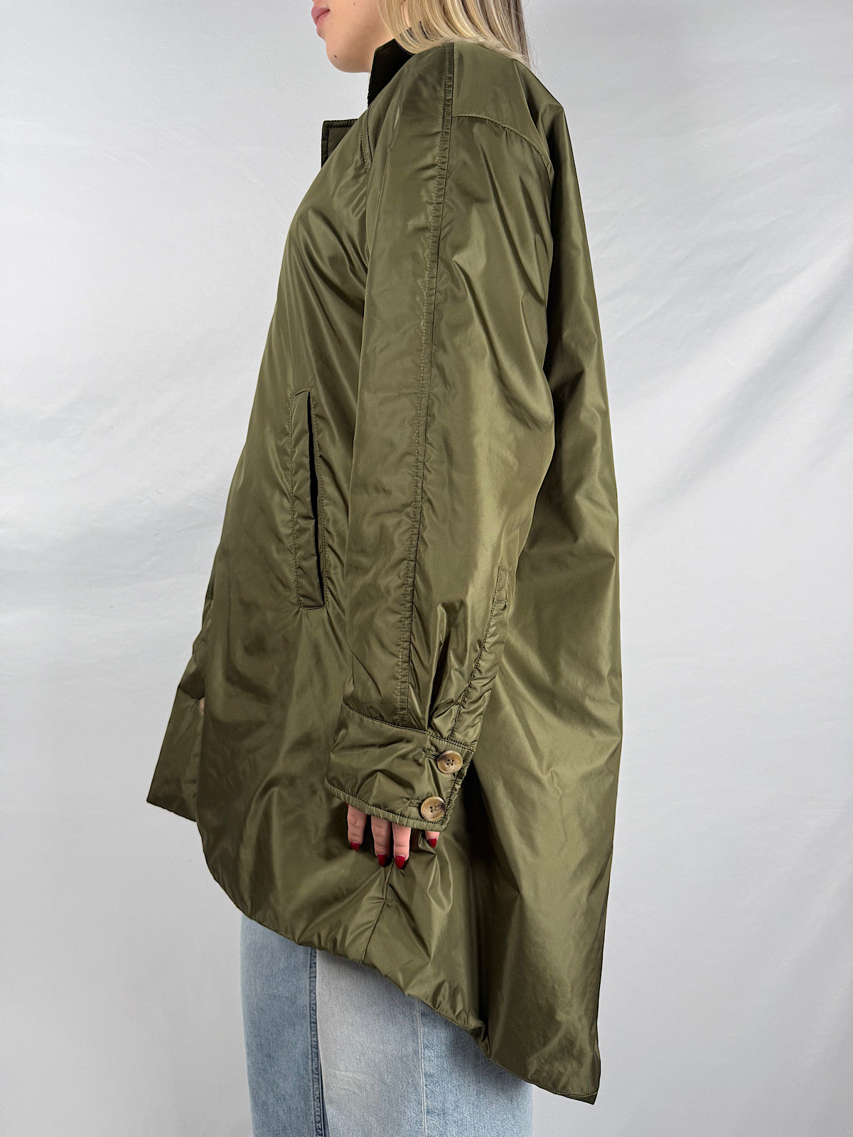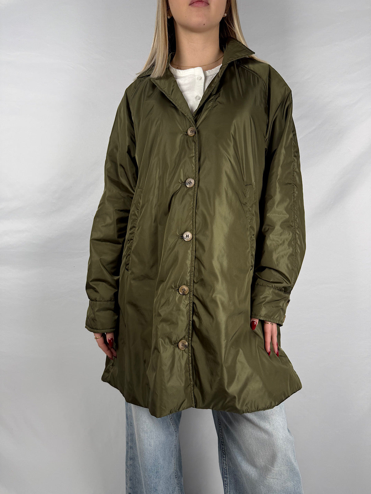 Trench medio svasato con rever. Maniche lunghe e chiusura con bottoni. Tasche a filetto. Dettaglio bottoni sui polsi e riga centrale posteriore. Modello imbottito liscio.