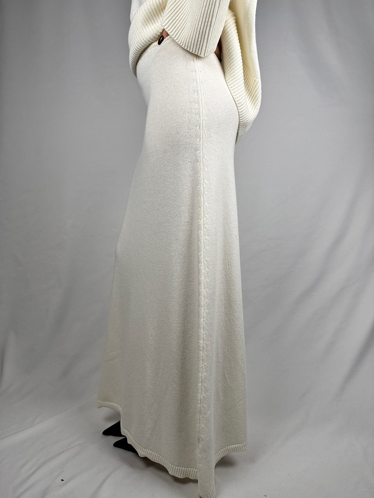 Gonna in maglia misto viscosa, lana e cachemire. Modello lungo, svasato con elastico in vita e costine sul fondo. Vestibilità regolare.