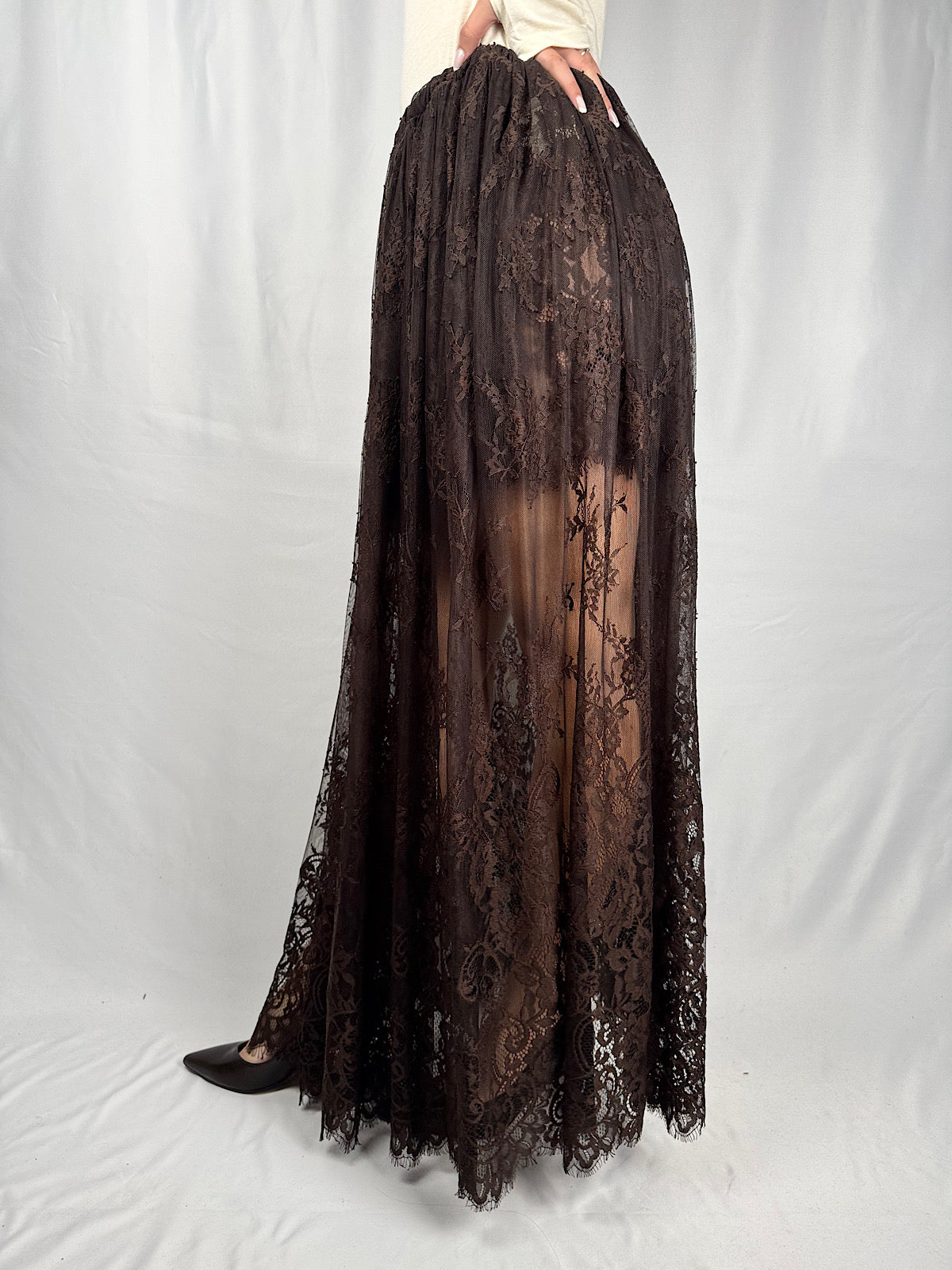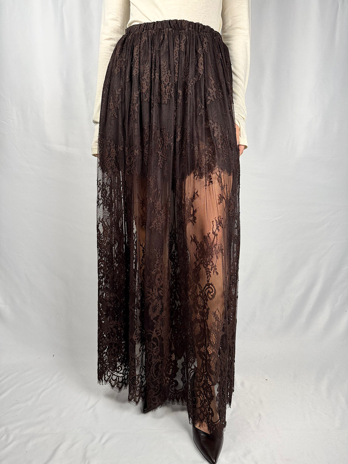 Gonna lunga in pizzo trasparente con balza interna. Elastico in vita.