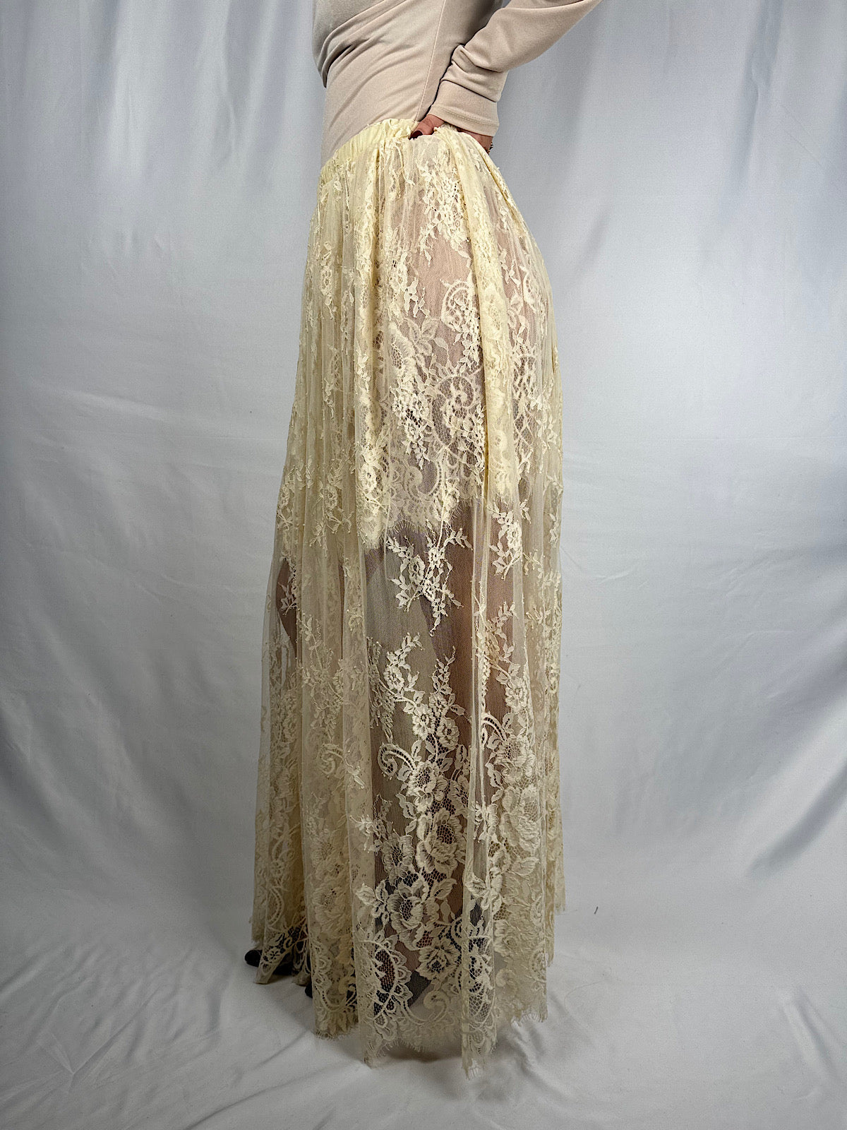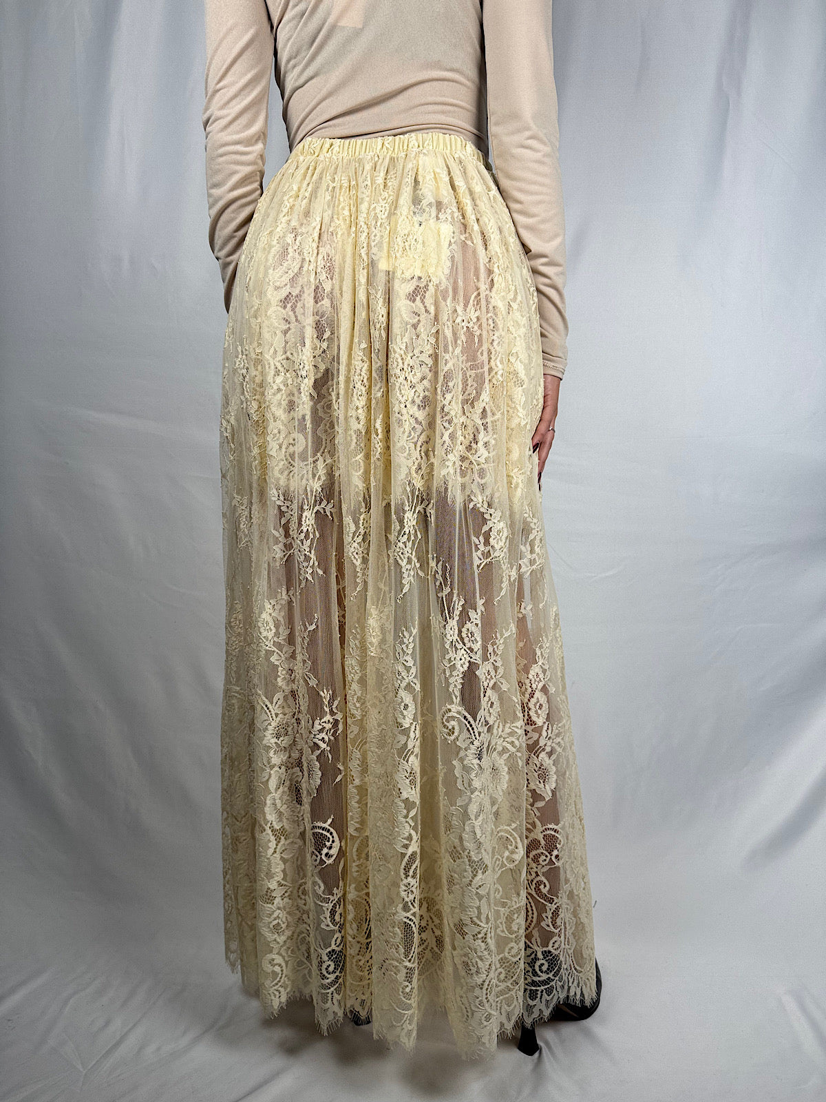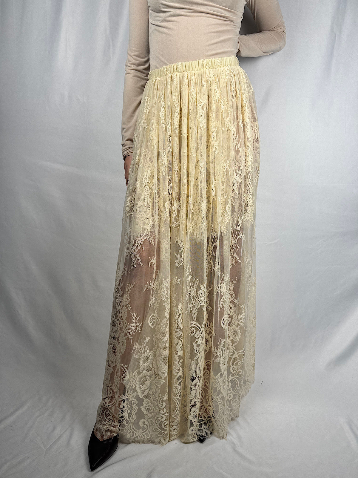 Gonna lunga in pizzo trasparente con balza interna. Elastico in vita.