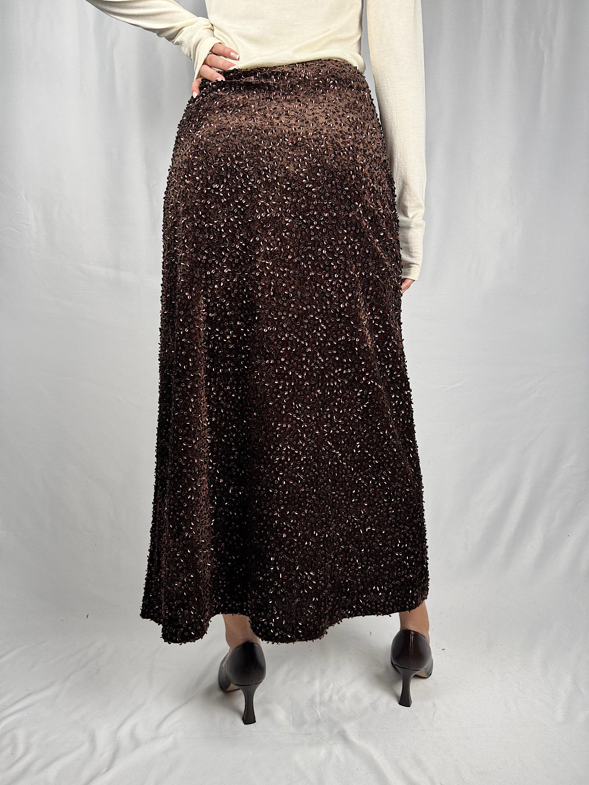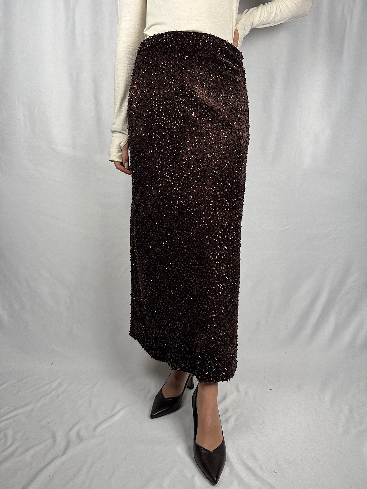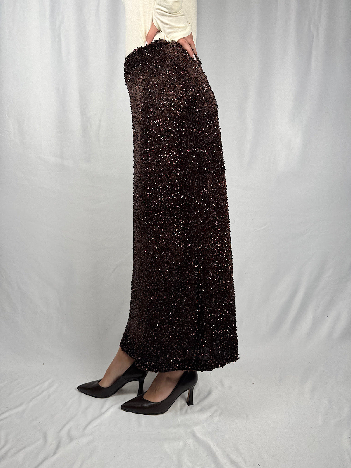 Gonna lunga in velluto con paillettes piatte. Chiusura a zip