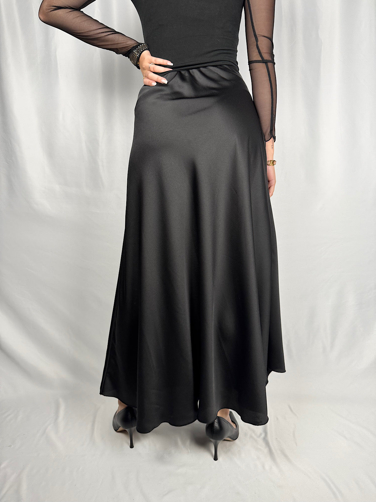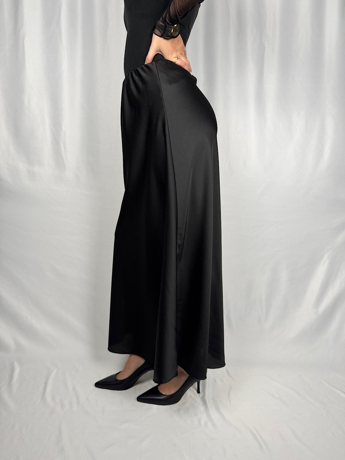 Gonna lunga in raso lucido. Vita alta con elastico.