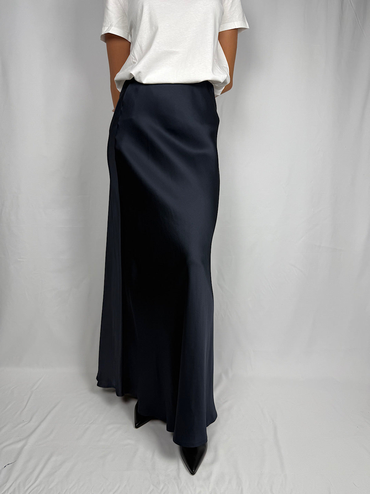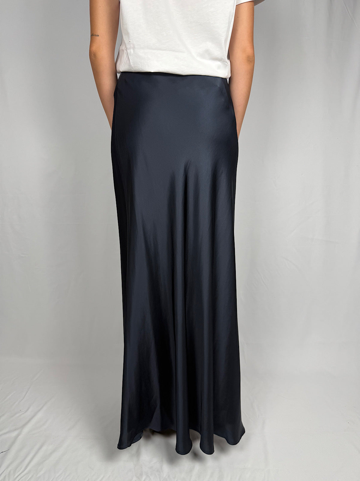 Gonna lunga in raso di viscosa lucido effetto satin. Vita alta con elastico.