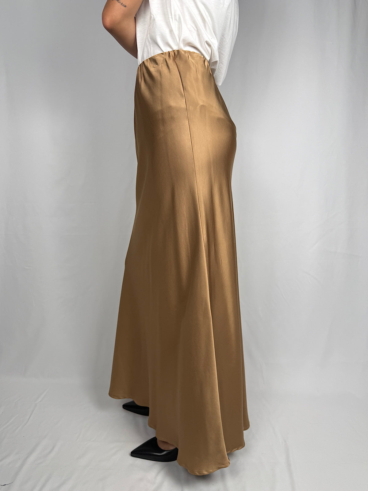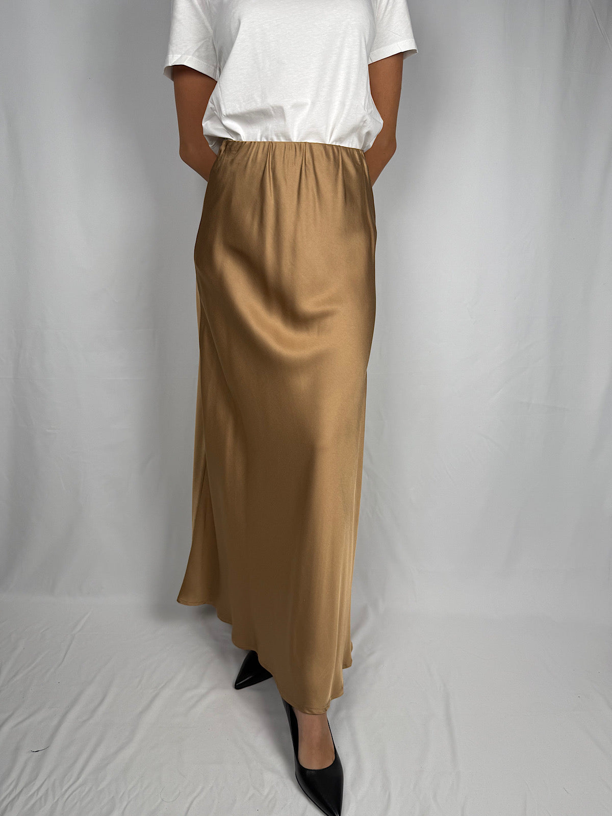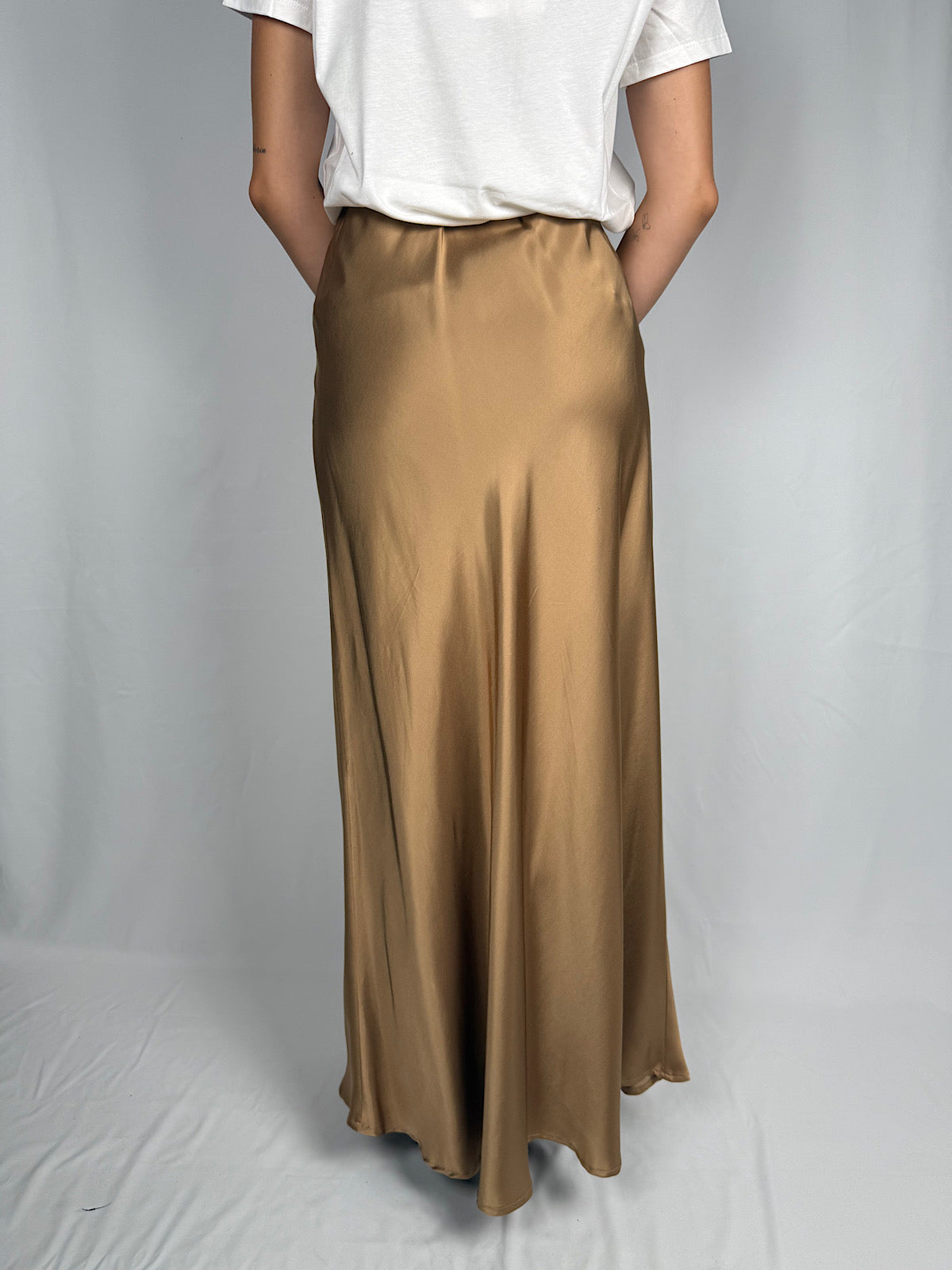 Gonna lunga in raso di viscosa lucido effetto satin. Vita alta con elastico.