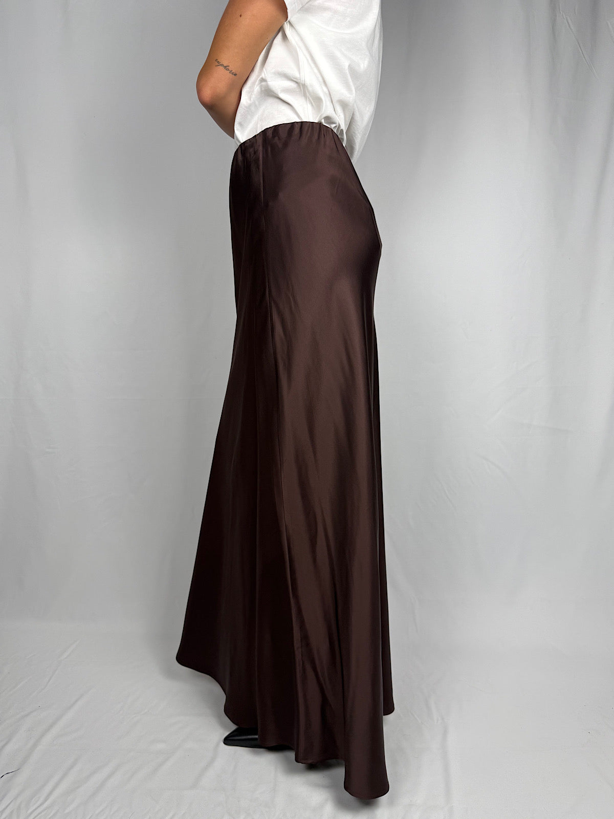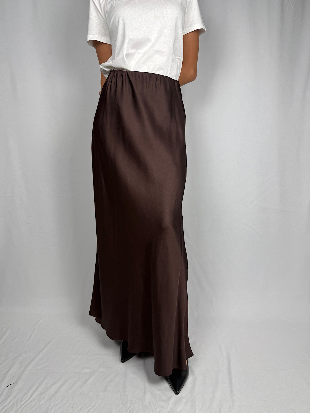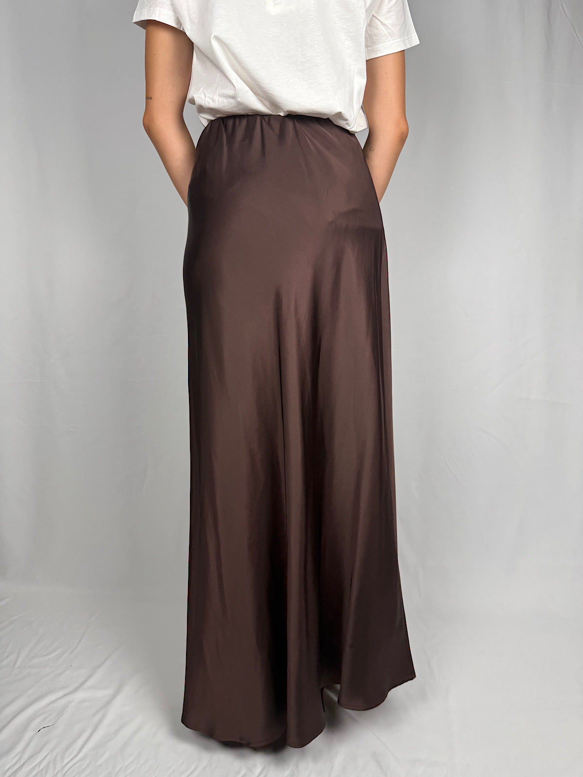 Gonna lunga in raso di viscosa lucido effetto satin. Vita alta con elastico.