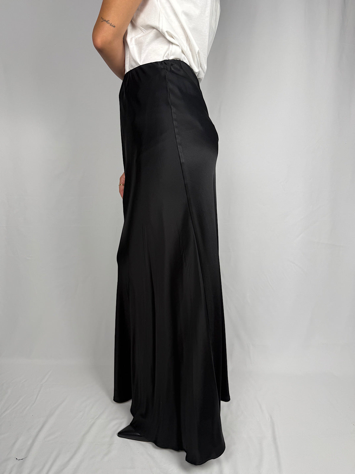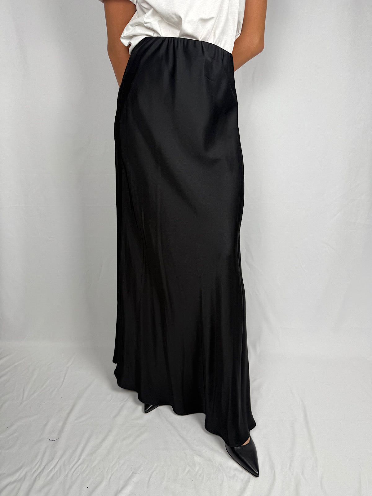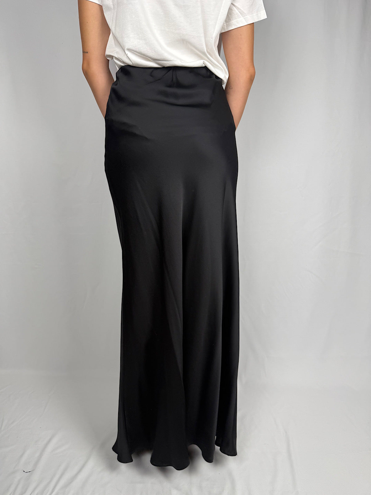 Gonna lunga in raso di viscosa lucido effetto satin. Vita alta con elastico.