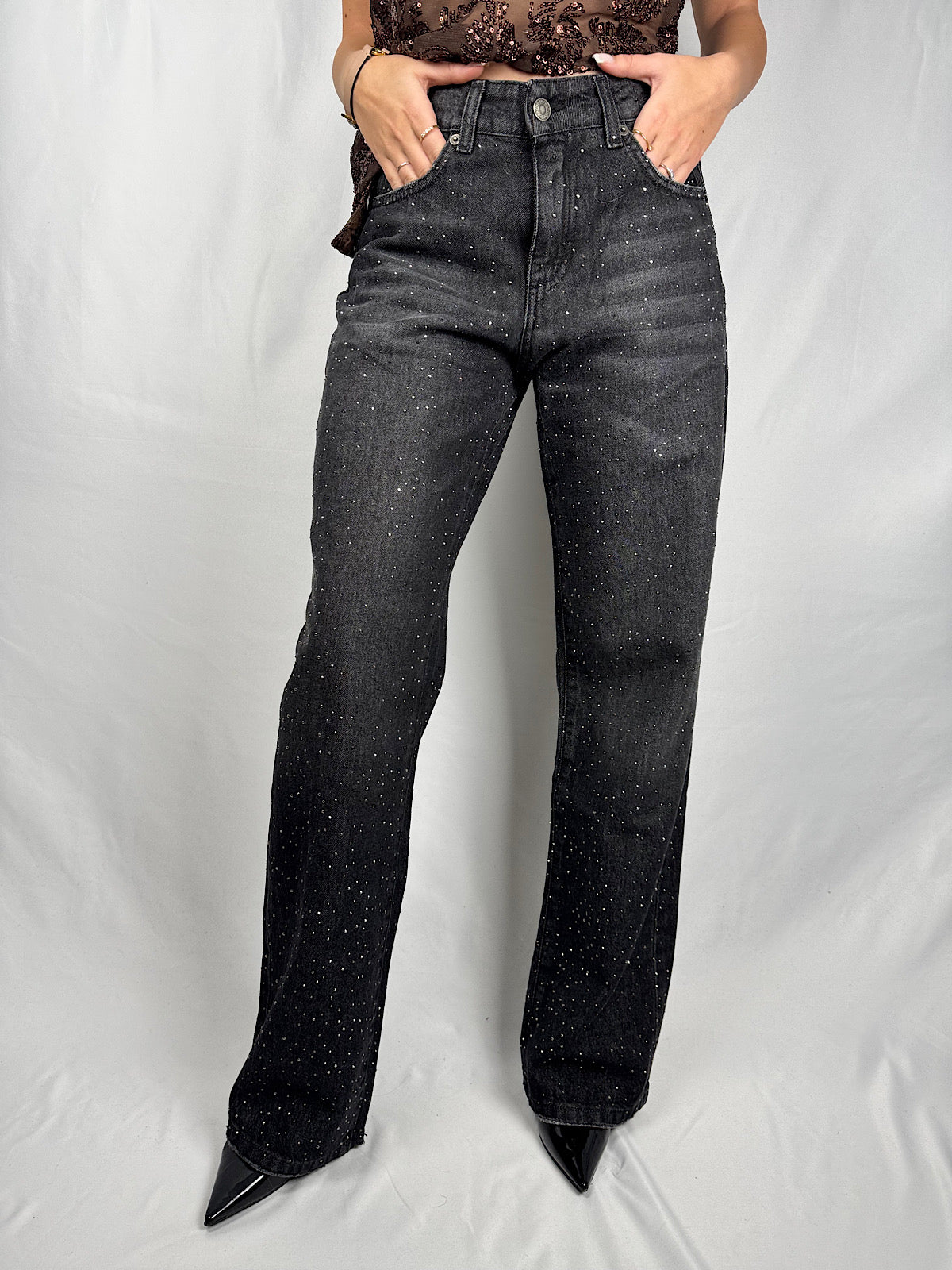 Jeans Melody a gamba dritta, vita media, modello cinque tasche, chiusura con bottone e zip. Dettaglio strass applicati.