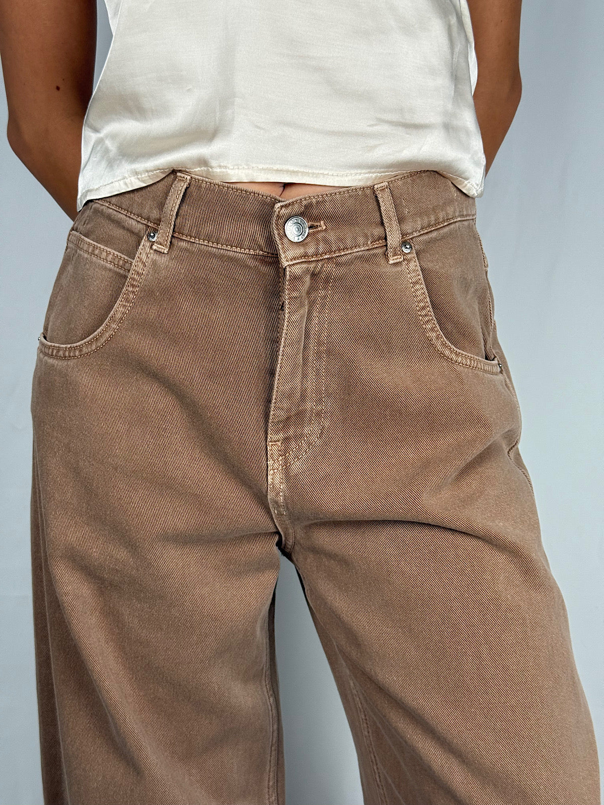 Jeans Ampio modello cinque tasche. Chiusura frontale con zip e bottone in metallo. Vita media gamba ampia. Denim cammello.