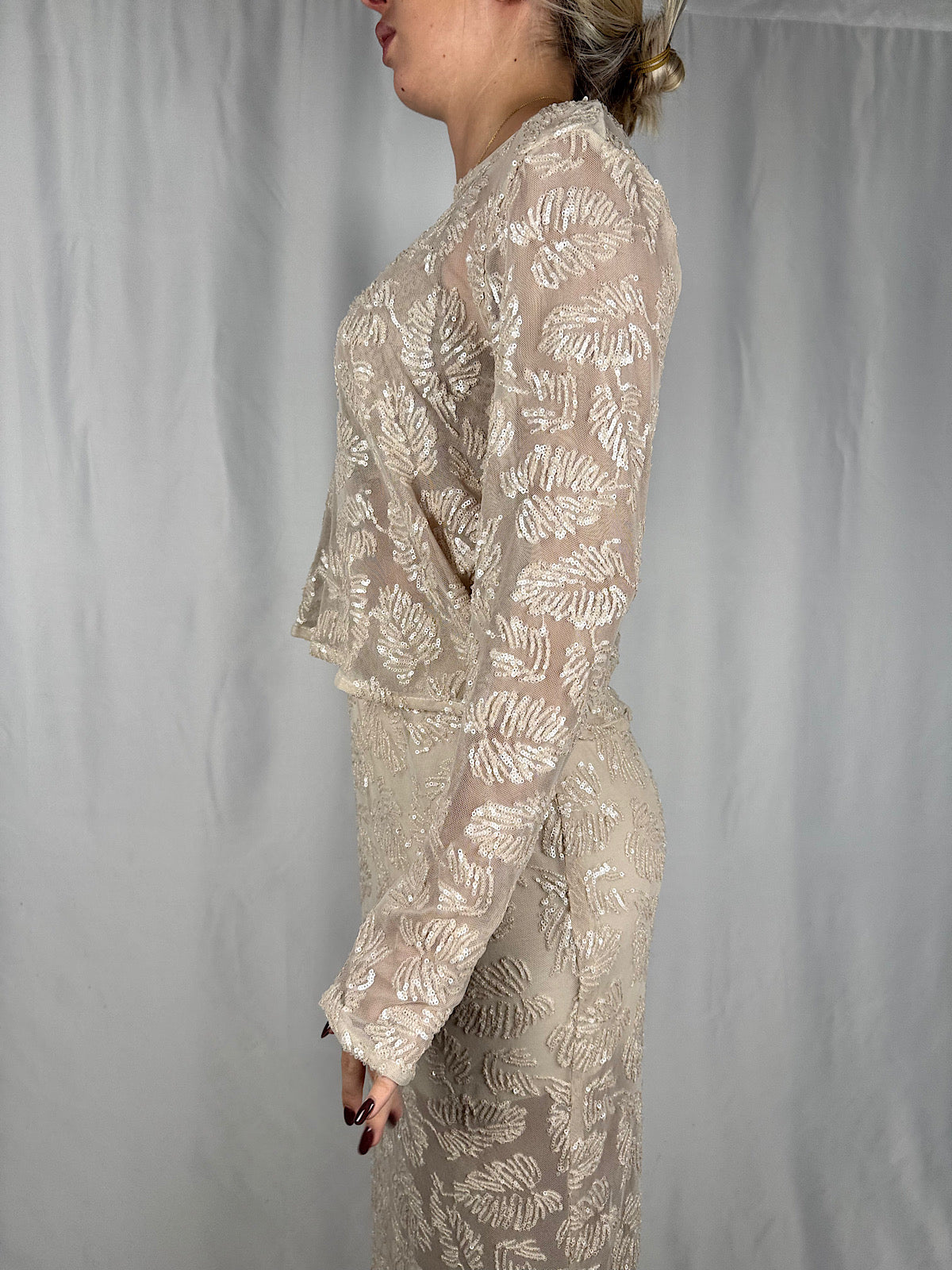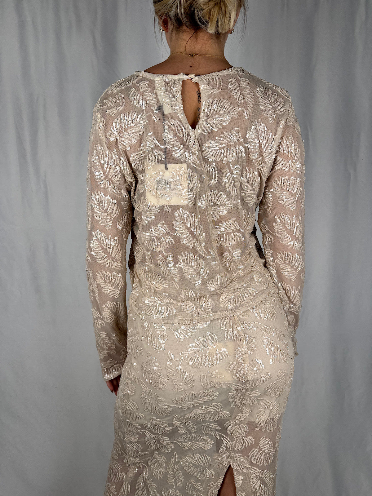 Maglia a maniche lunghe con pailletes, chiusura posteriore con bottone.