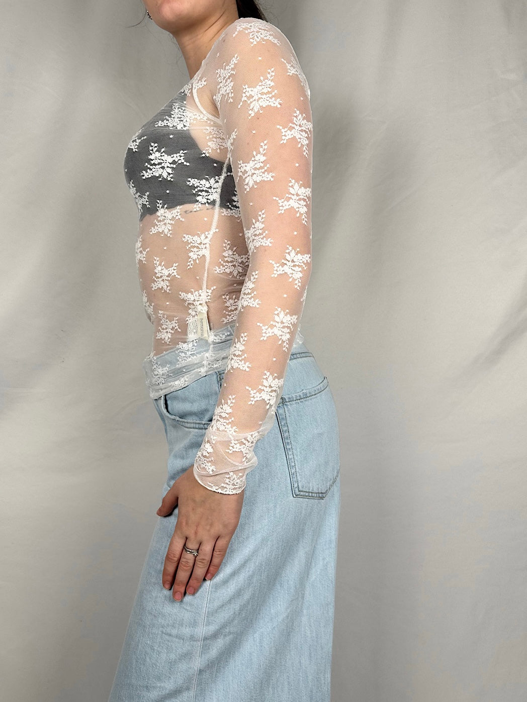 Maglia in pizzo maniche lunghe scollatura barchetta.