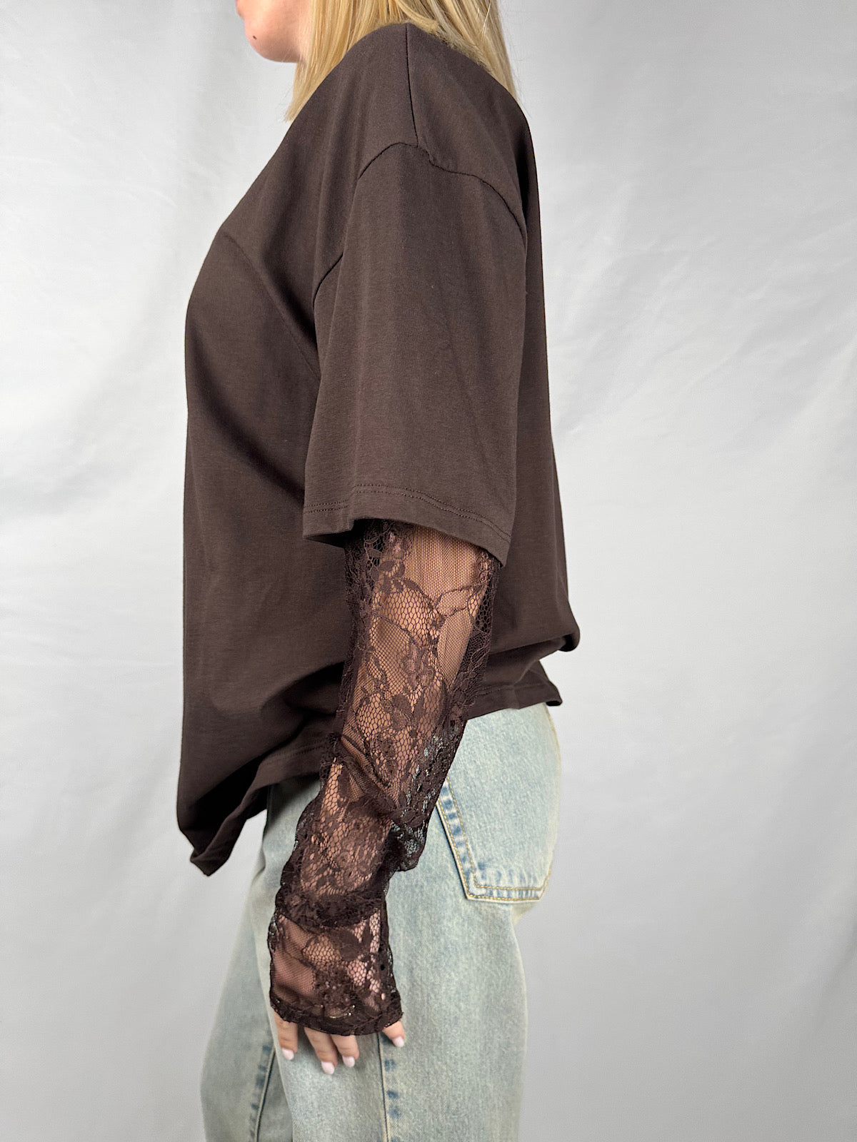 T-shirt girocollo maniche corte effetto combinato maniche lunghe in pizzo trasparente.