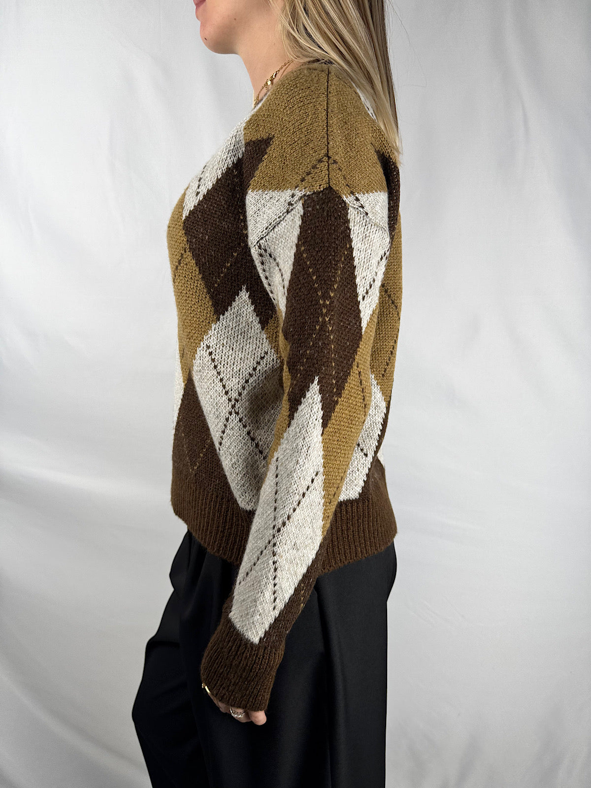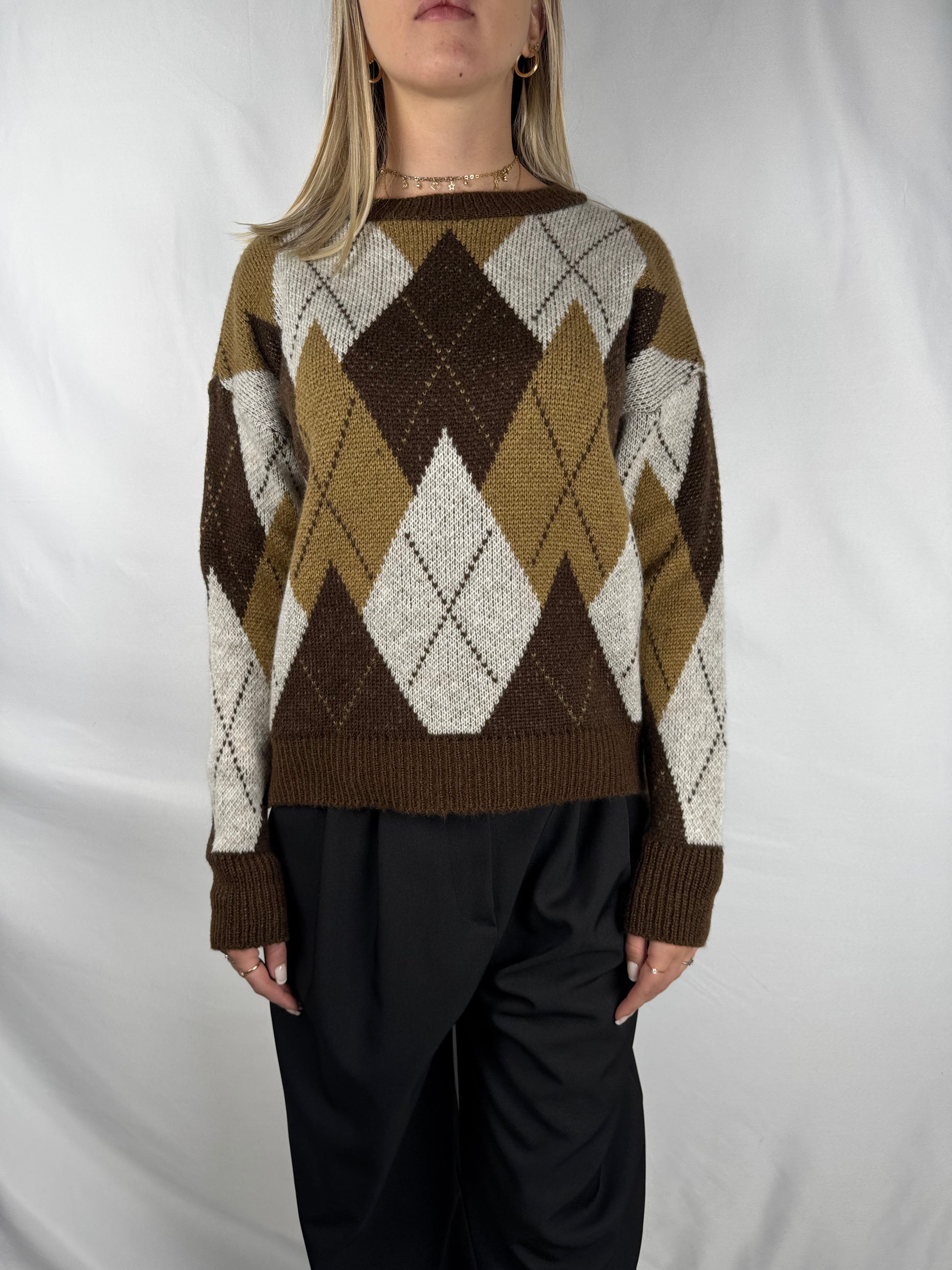 Maglia girocollo a rombi manica lunga nei toni marrone/cammello/panna.