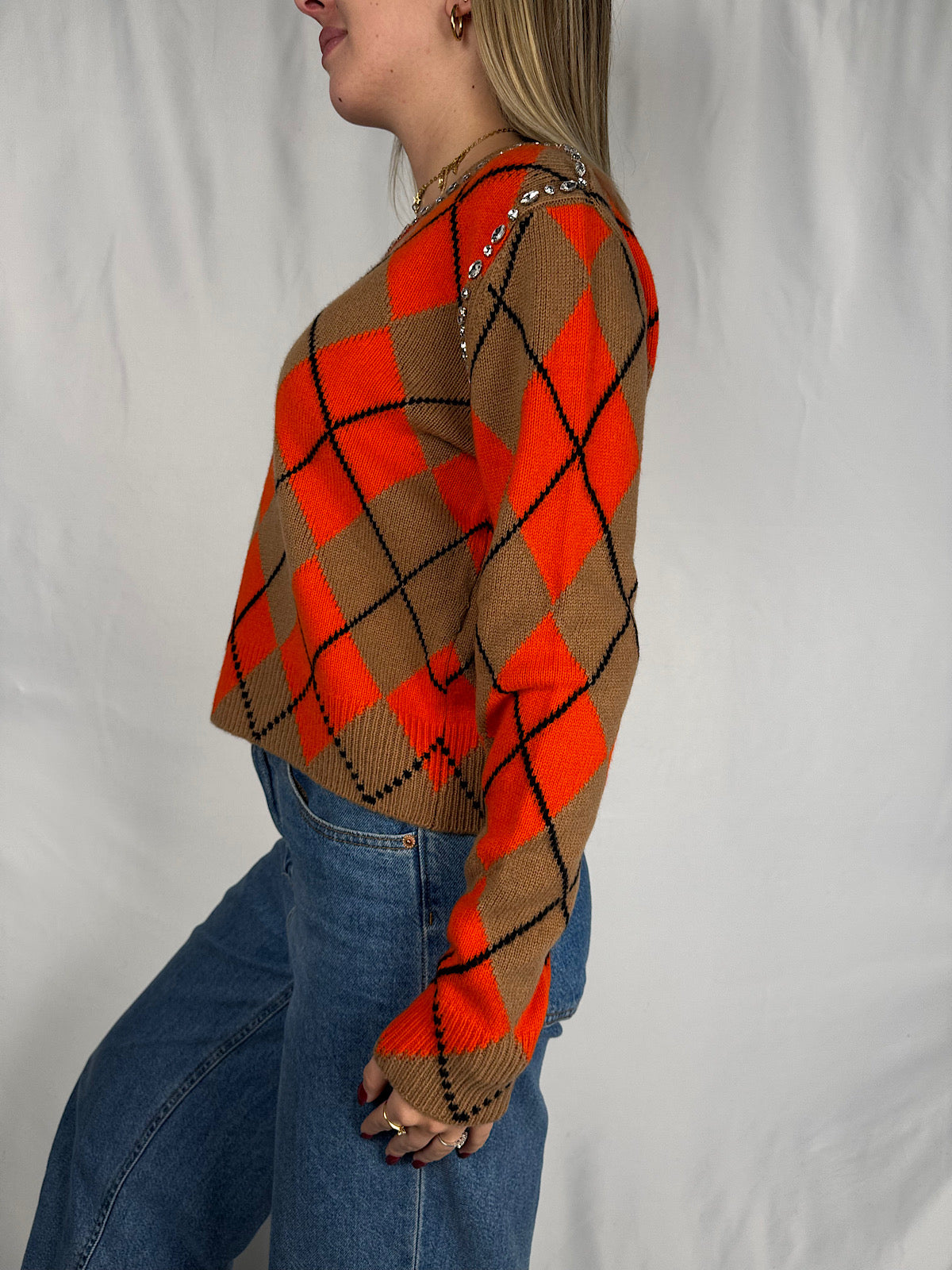 Maglia Girocollo a Rombi con Cabochon Arancio/Cammello Vicolo