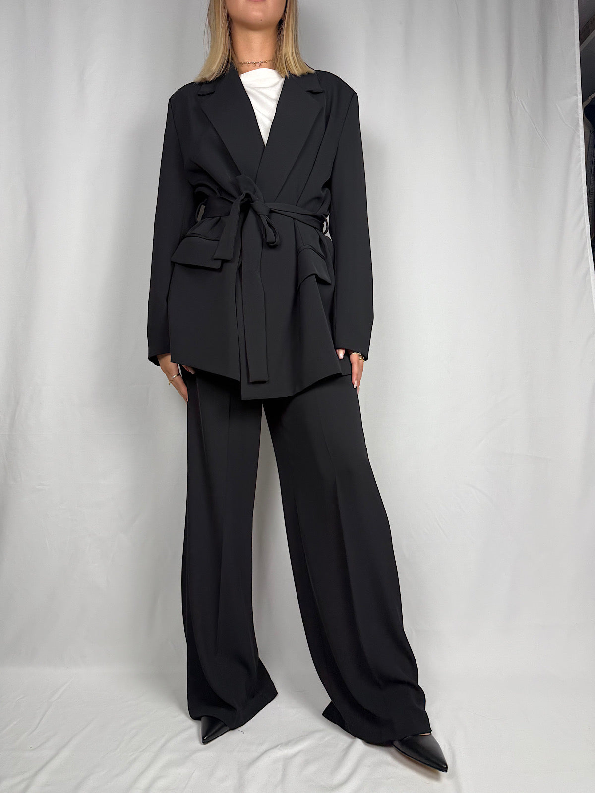 Pantalone dritto a vita alta con elastico posteriore. Tasche frontali.