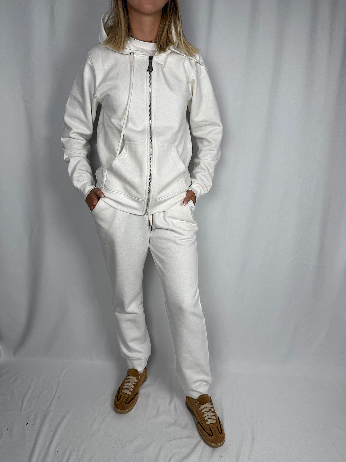 Pantalone in felpa bianco con vita regolabile ed elastico alla caviglia. Tasche frontali con dettaglio ricamato.