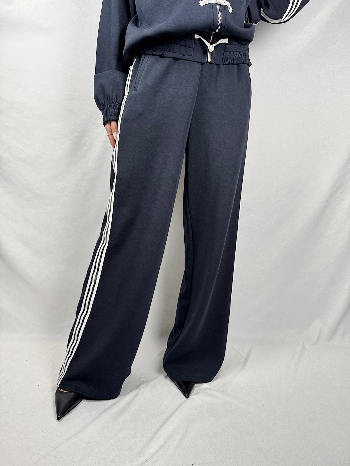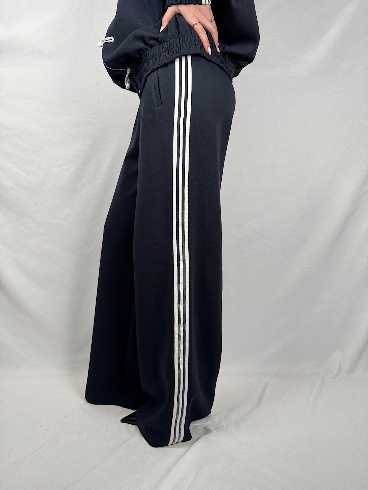 Pantalone joggers con bande sportive laterali in cotone modello a palazzo gamba morbida e vita alta elasticizzata con coulisse regolabile.